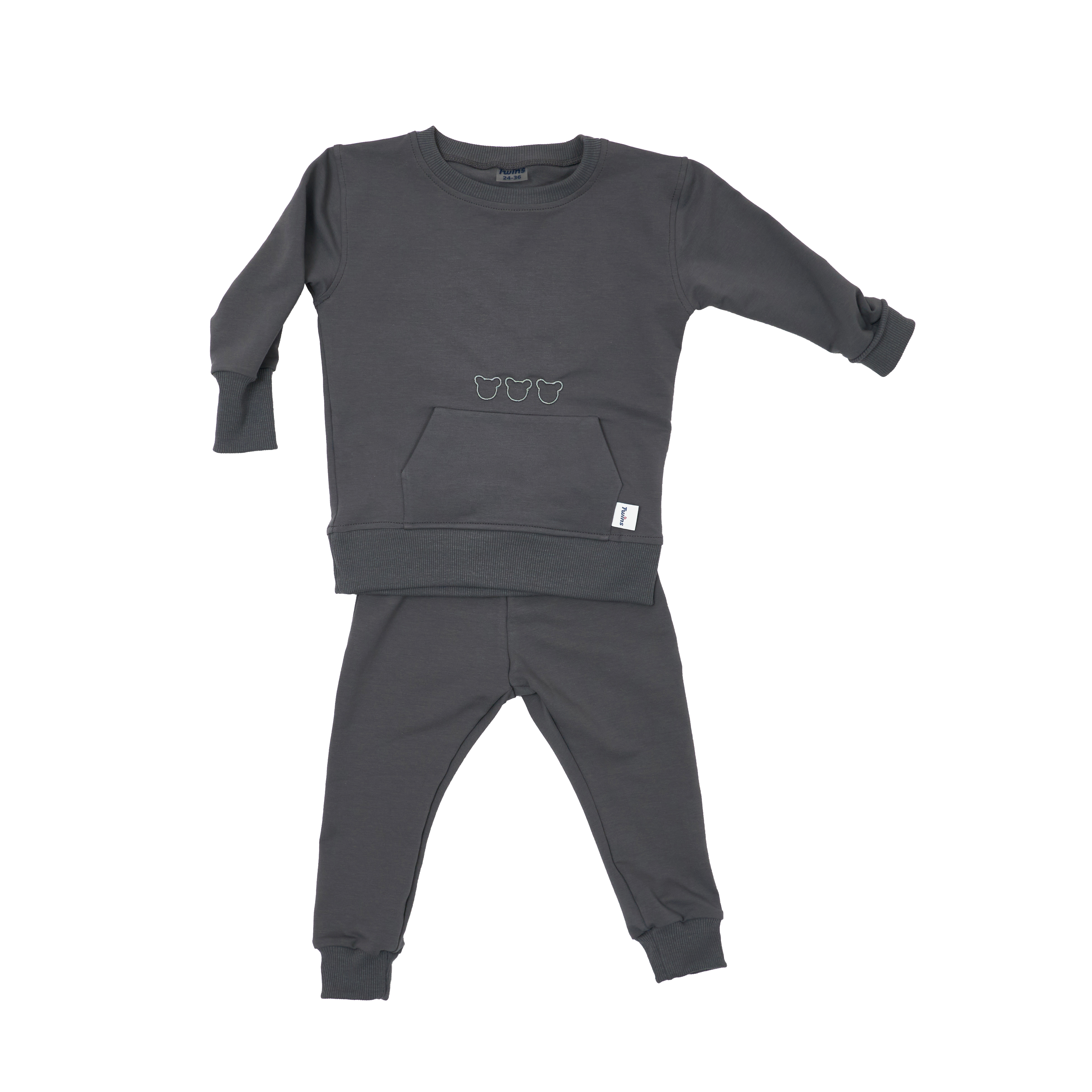The set consists of a sweatshirt with a pocket and embroidery, as well as pants with a soft elastic band that does not press on the tummy.