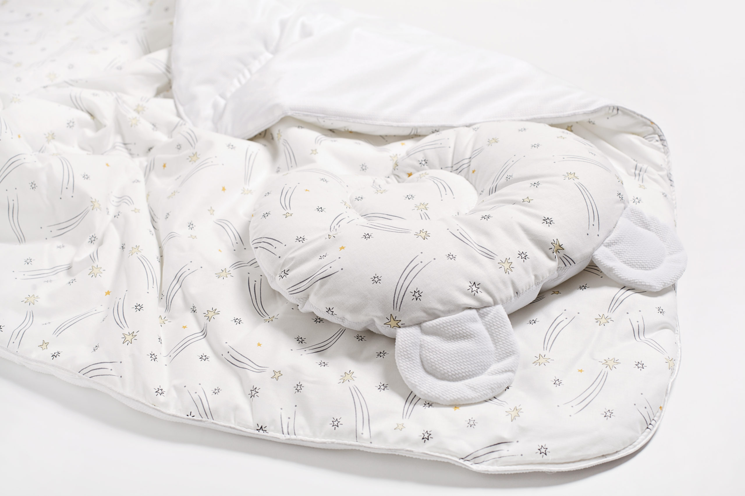 The set is universal in use, as it consists of 2 items: an orthopedic pillow and a blanket with a tie, which transforms it into an envelope. Buying a set of Twins Bear, you get a beautiful envelope for discharge, and then use it for a long time as a blanket and pillow in the stroller or in the crib. The envelope is double-sided, made of soft velor and additionally insulated.