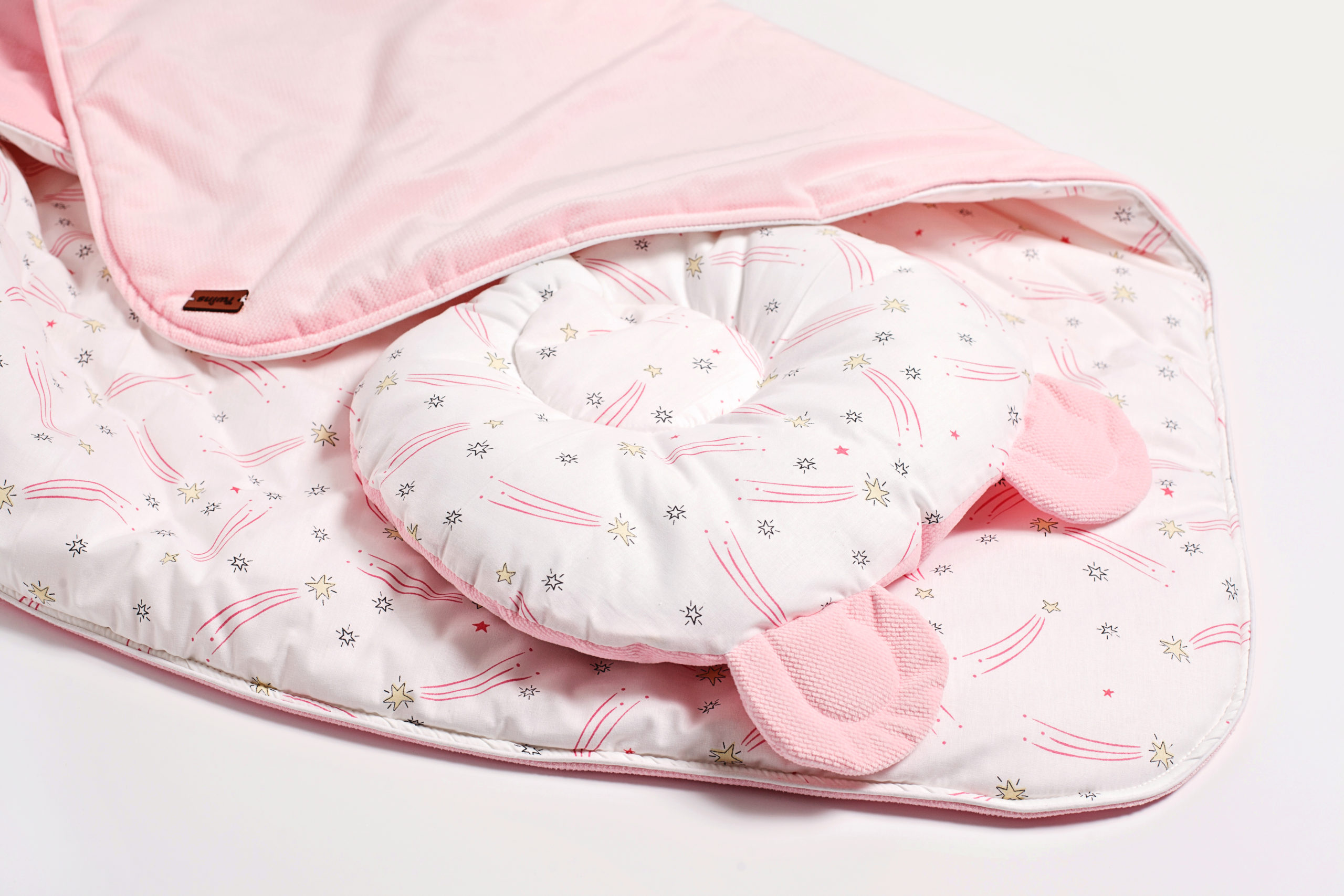 The set is universal in use, as it consists of 2 items: an orthopedic pillow and a blanket with a tie, which transforms it into an envelope. Buying a set of Twins Bear, you get a beautiful envelope for discharge, and then use it for a long time as a blanket and pillow in the stroller or in the crib. The envelope is double-sided, made of soft velor and additionally insulated.