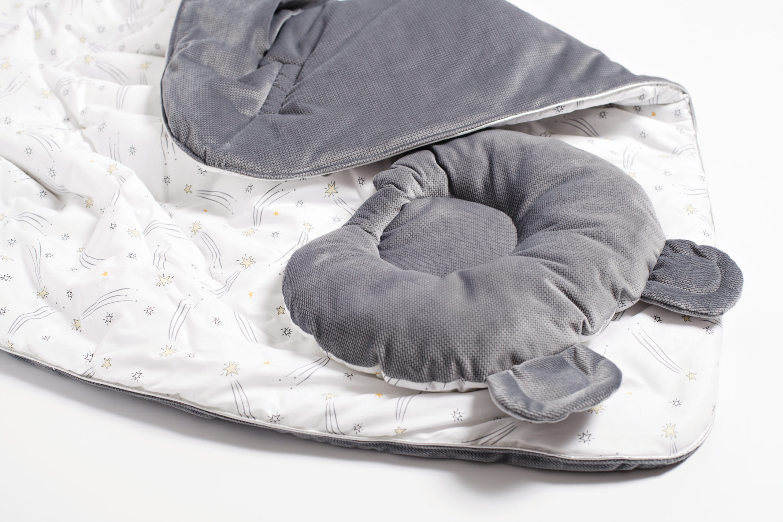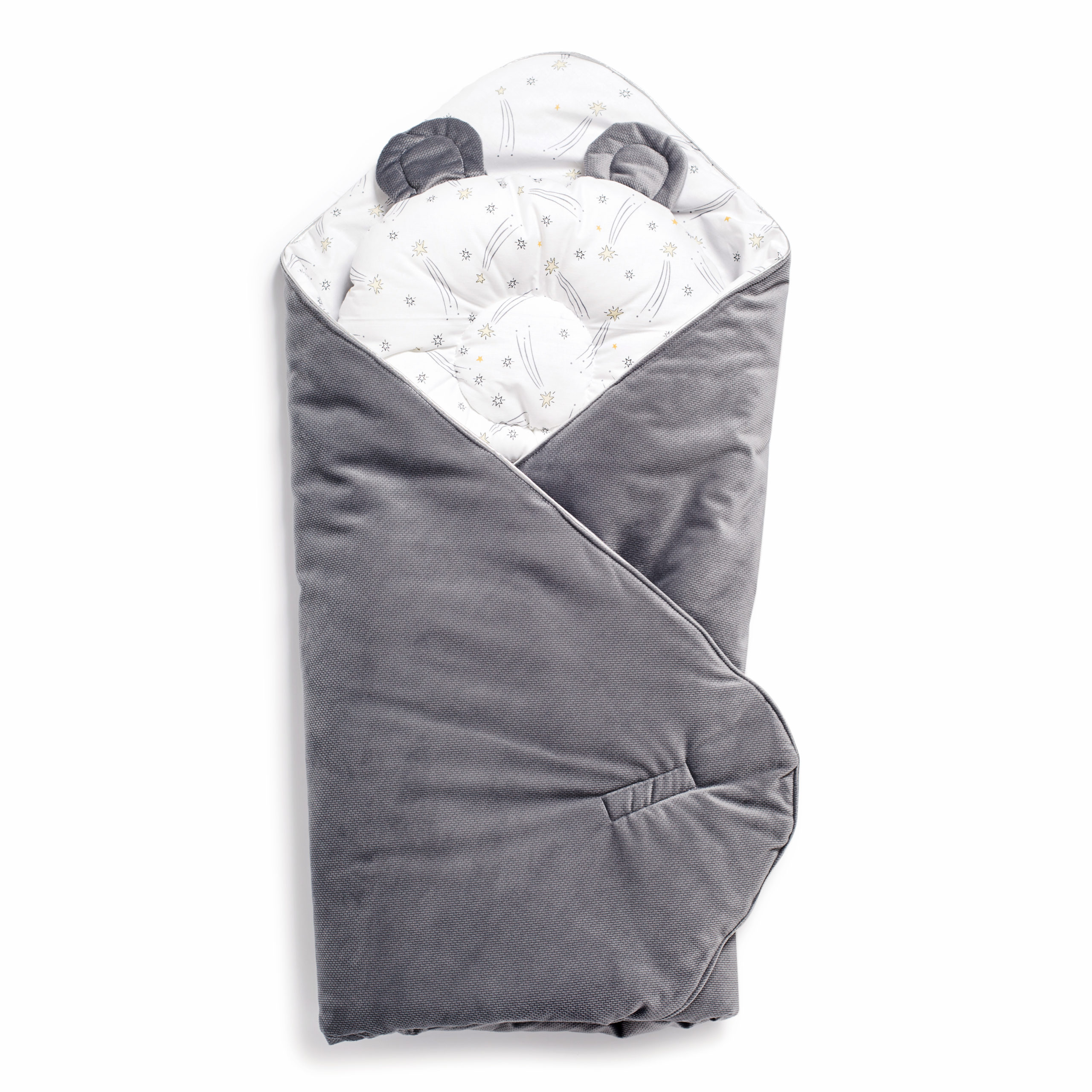 The set is universal in use, as it consists of 2 items: an orthopedic pillow and a blanket with a tie, which transforms it into an envelope. Buying a set of Twins Bear, you get a beautiful envelope for discharge, and then use it for a long time as a blanket and pillow in the stroller or in the crib. The envelope is double-sided, made of soft velor and additionally insulated.