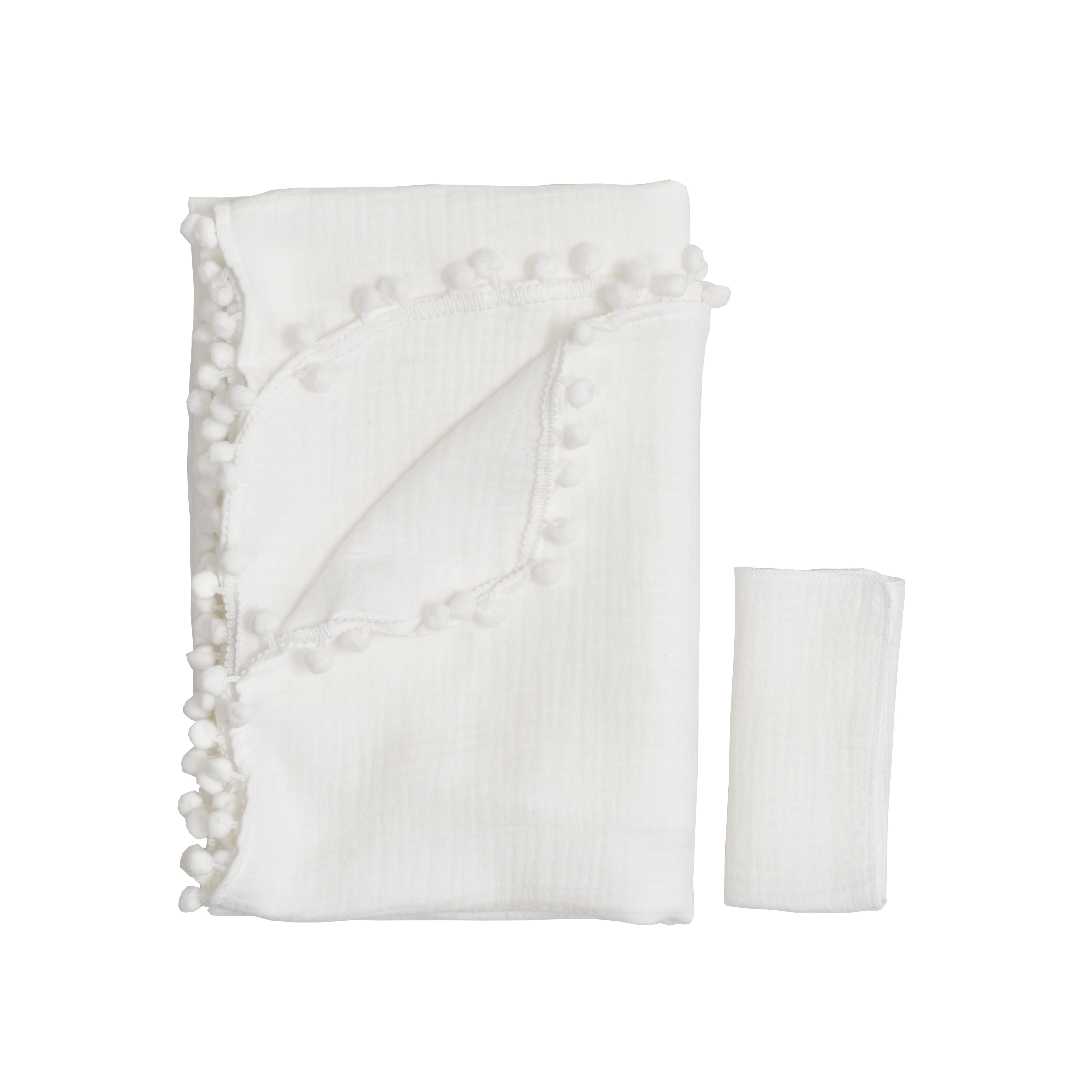 The Twins muslin 4-layer 100x100 cm blanket with pompoms + napkin is a stylish and practical accessory for your baby.
