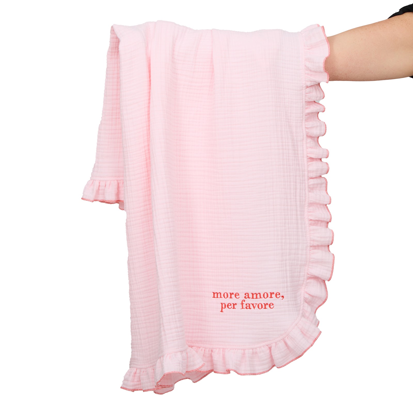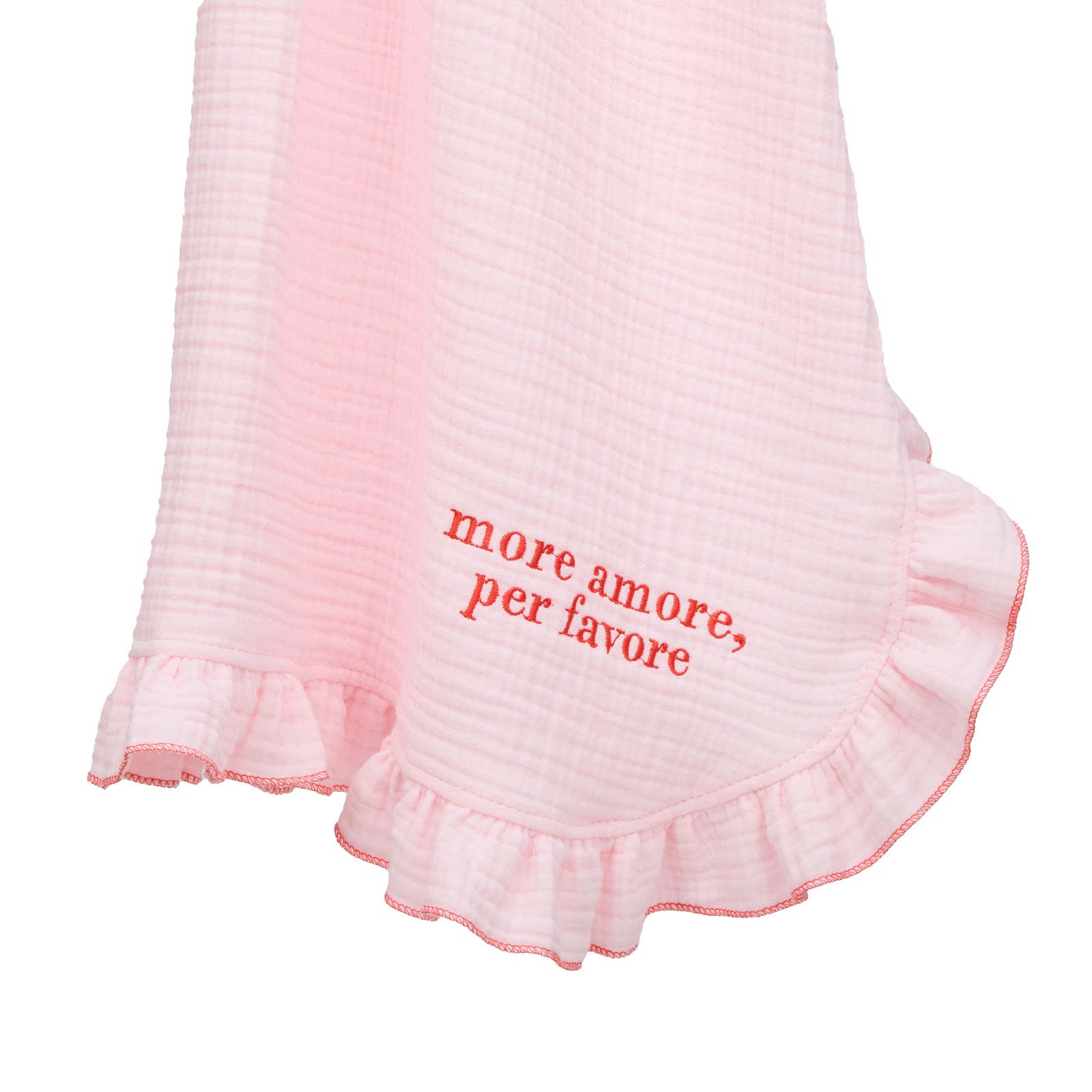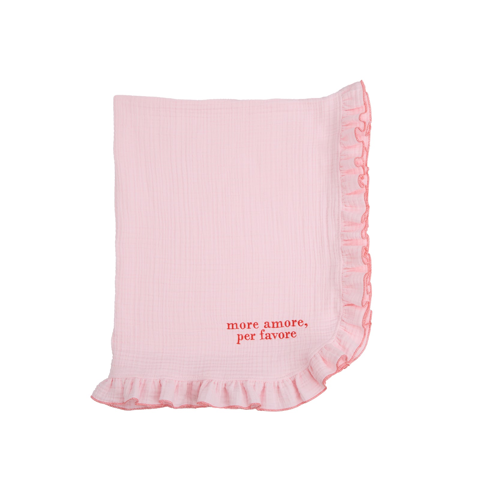 A special feature of the blanket is the decorative ruffle along the edge and the neat embroidery “more amore. per favore” on the side, adding a refined and elegant touch to the design.