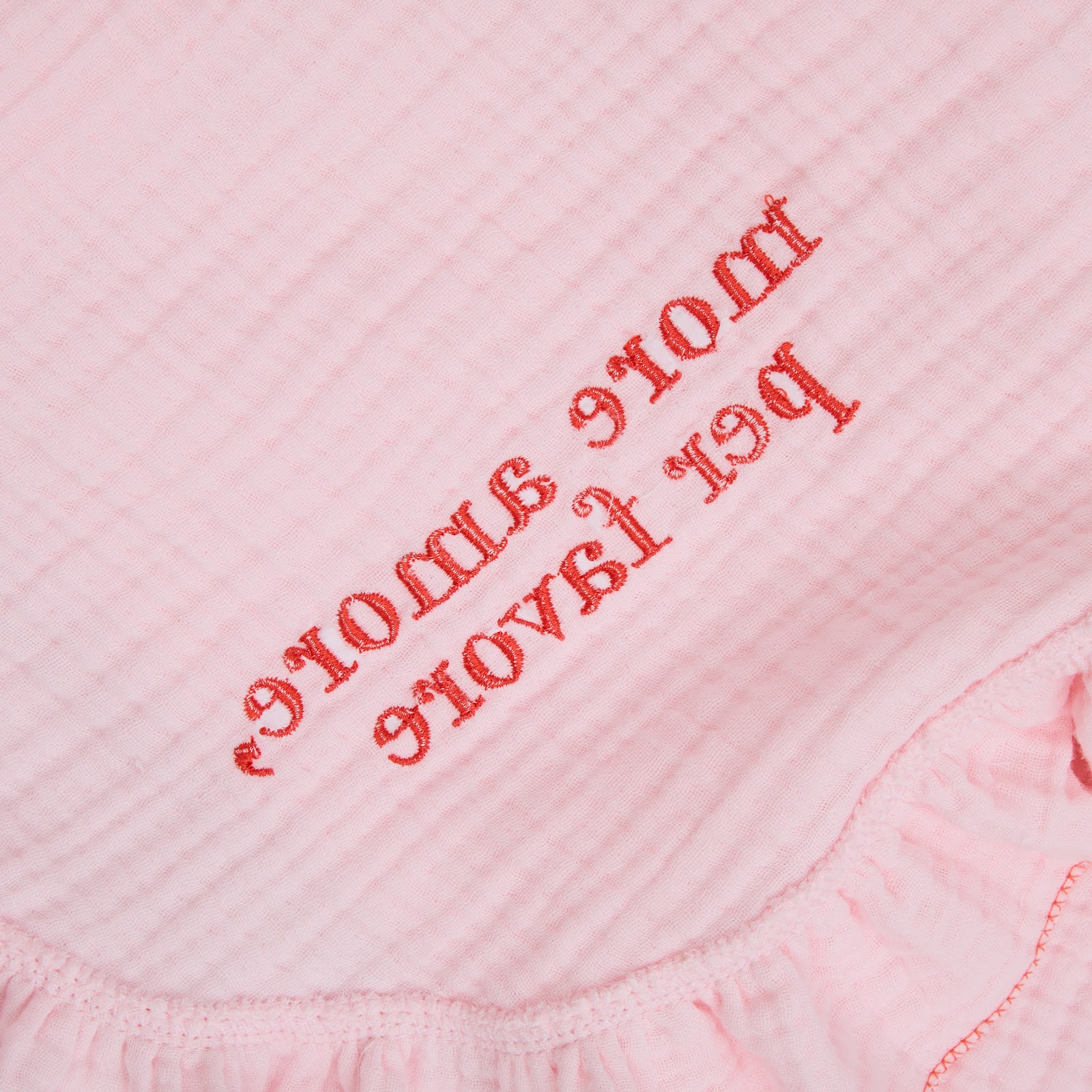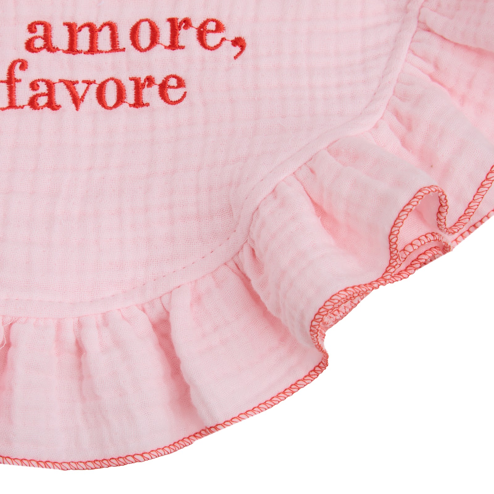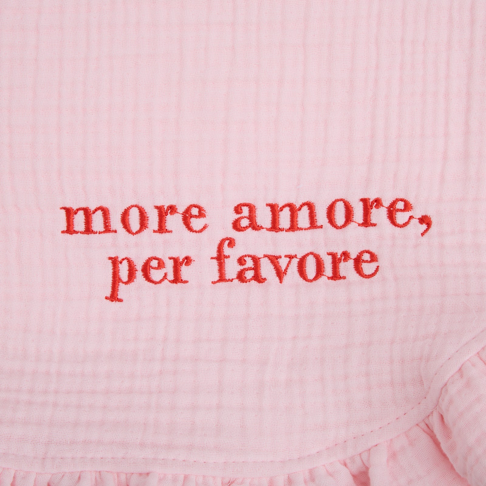 A special feature of the blanket is the decorative ruffle along the edge and the neat embroidery “more amore. per favore” on the side, adding a refined and elegant touch to the design.