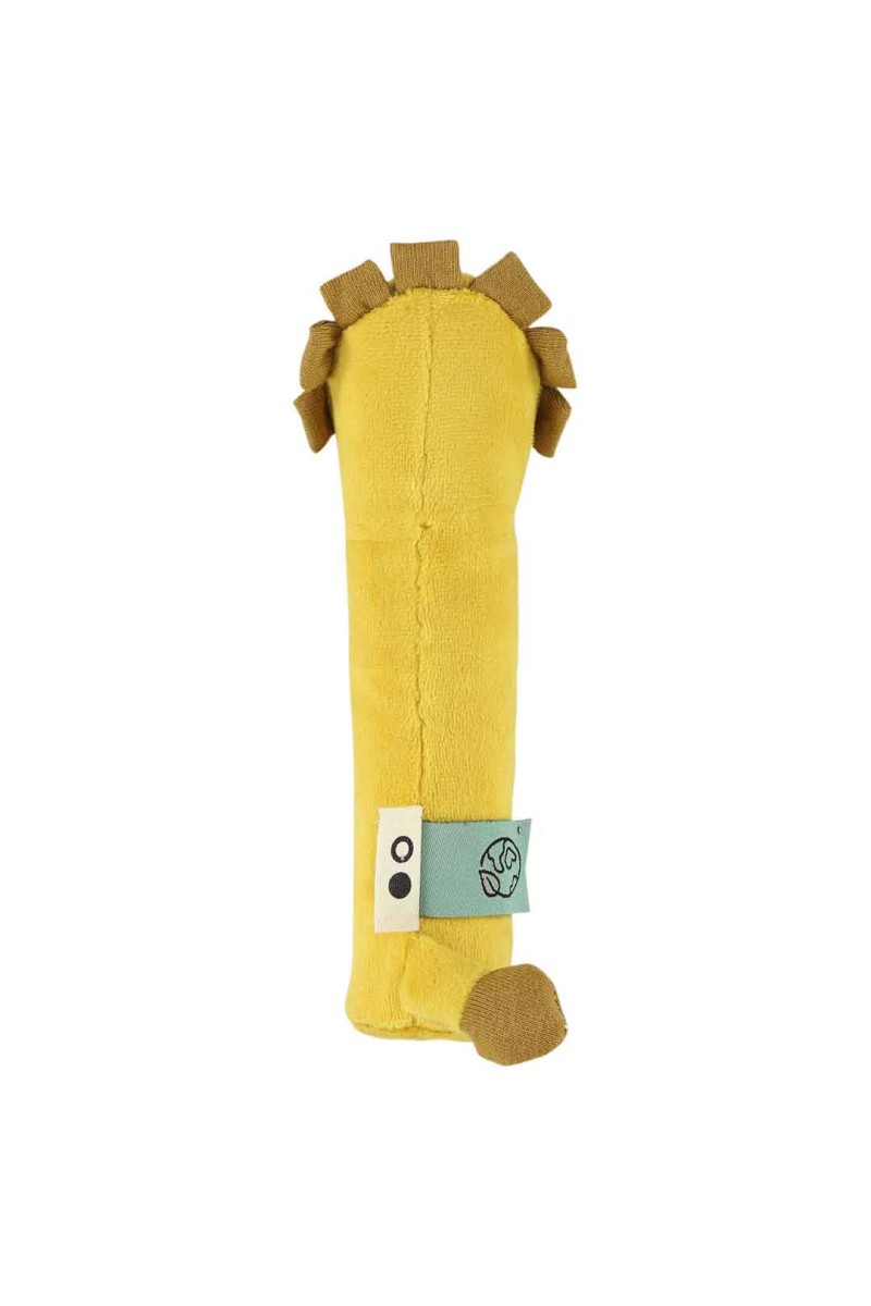 The children's plush hand squeaker toy is made of organic cotton and recycled polyester, which ensures softness and safety for sensitive baby skin.