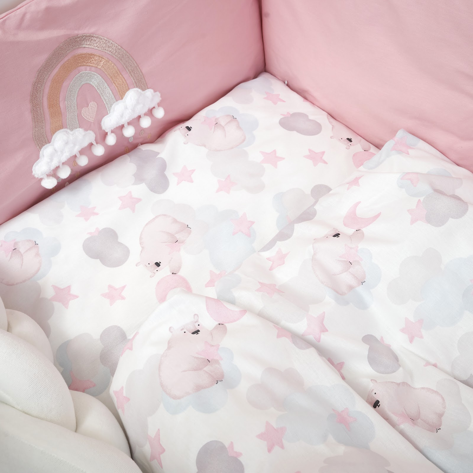 The cute bear print creates a special cozy atmosphere, and the delicate embroidery on the bumper adds aesthetic appeal to the set.