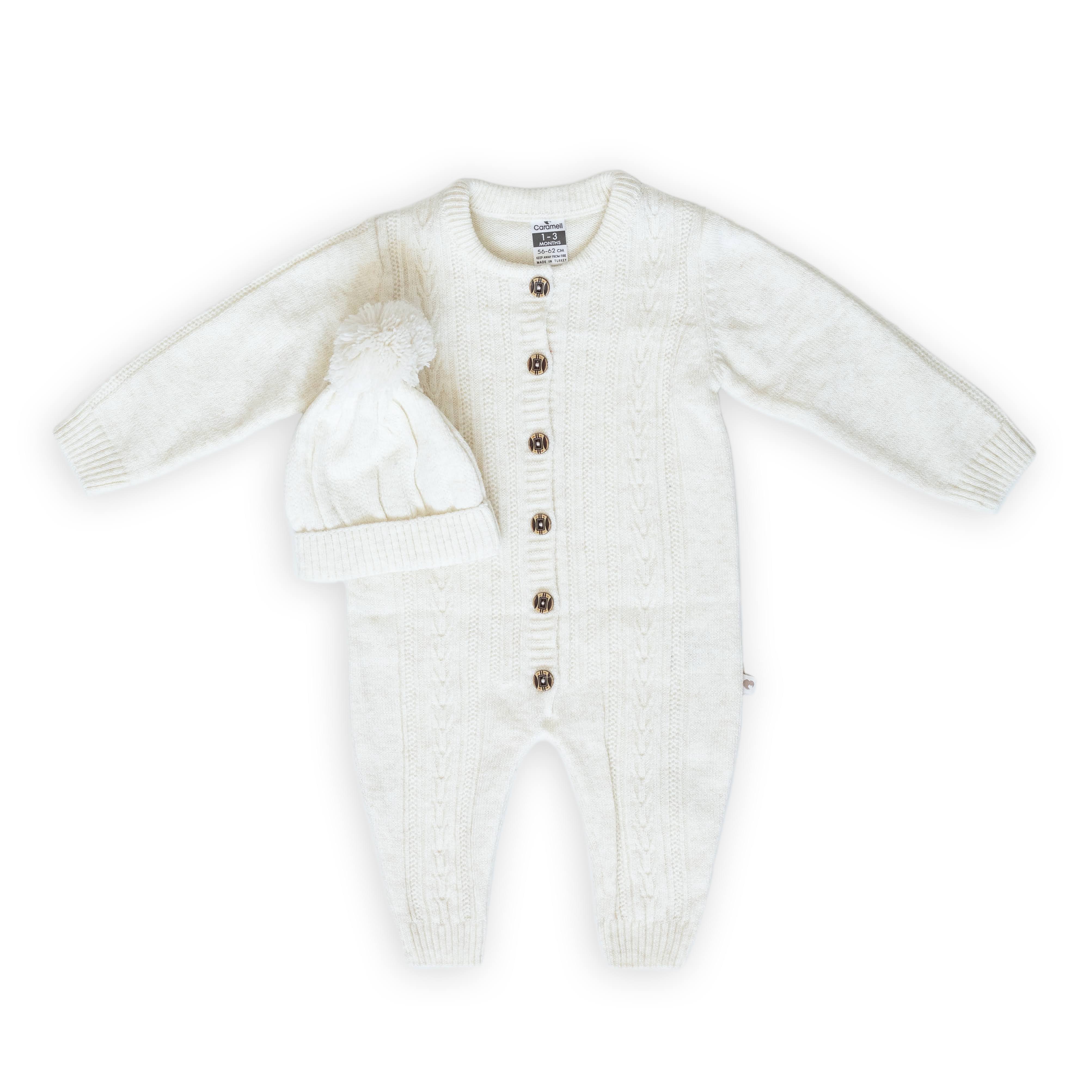 Insulated jersey romper embellished with buttons for quick and comfortable baby changing. < br>