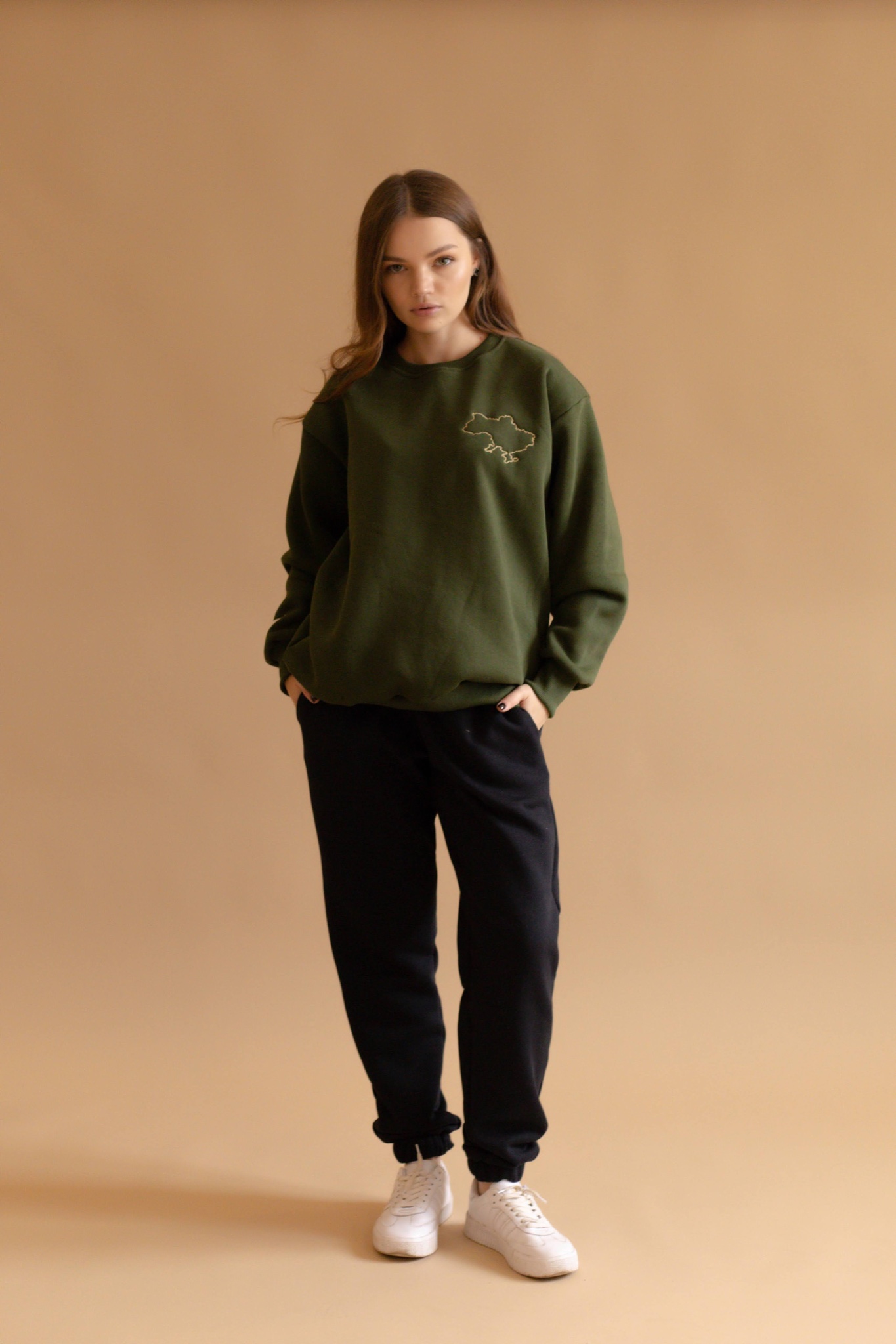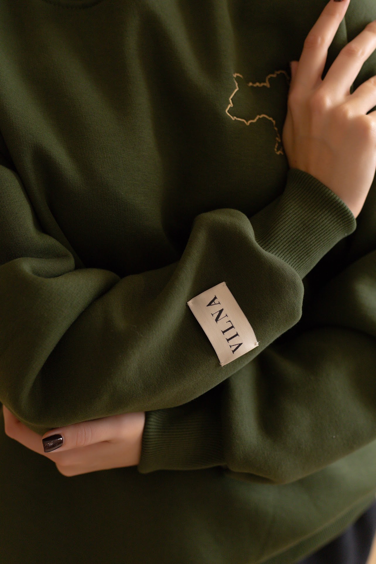 Khaki sweatshirt with loose sleeves. Arm and bottom of the product on the cuff.
