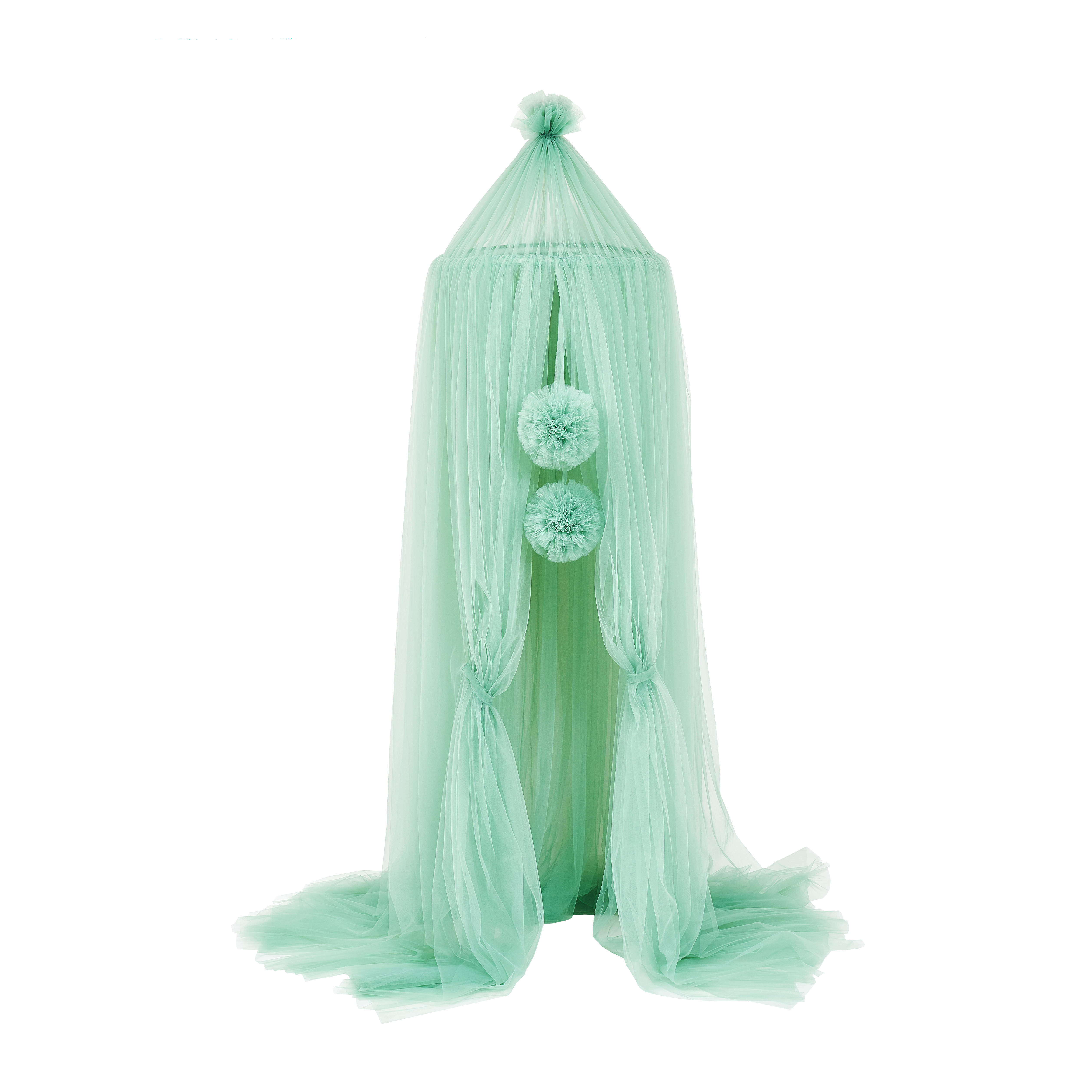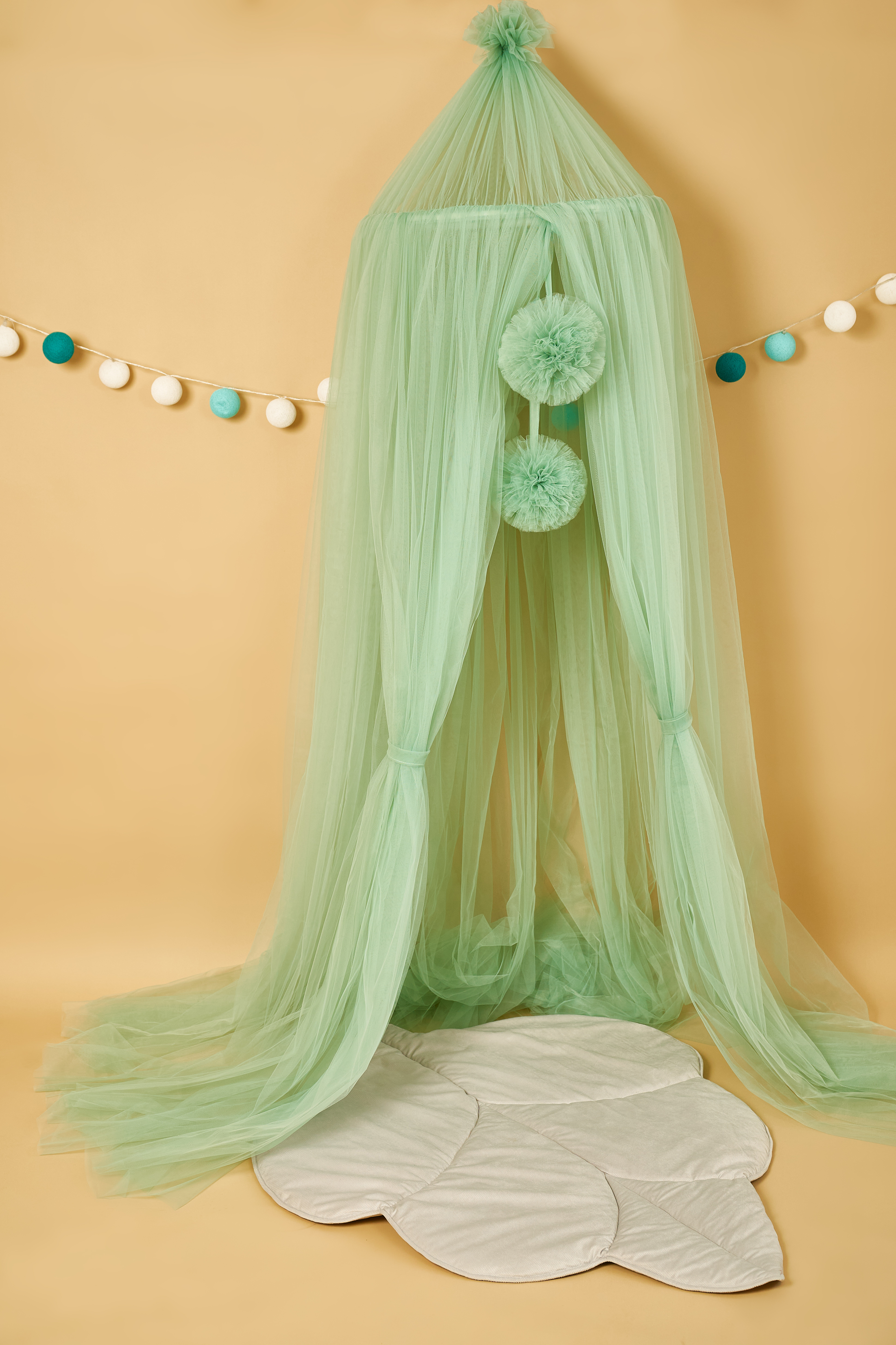 Балдахин изготовлен из нежного фатина, что создает эффект легкости и прозрачности, идеально подходит для детской комнаты.
