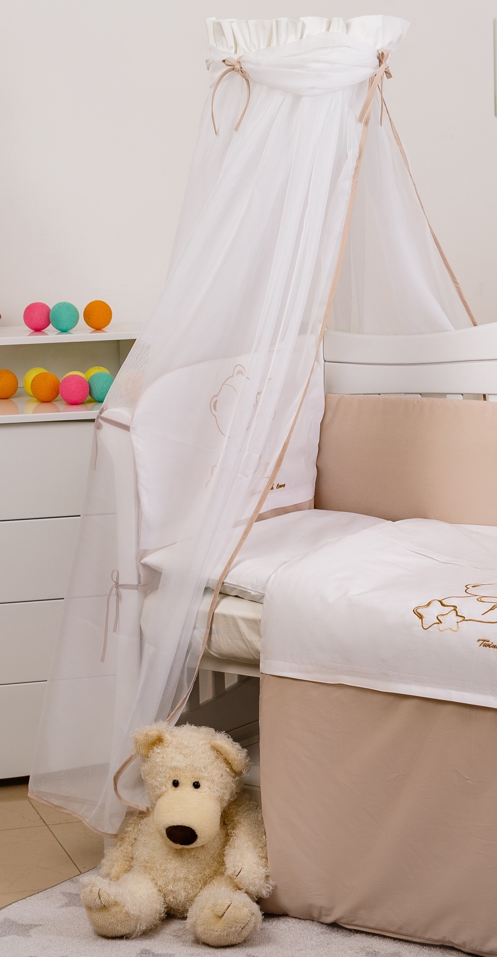 Балдахин Twins Dolce Loving bear изготовлена из приятного и нежного хлопка и полупрозрачной вуали, которая окутывает кроватку малыша, создает сказочную атмосферу, навевает сон. Балдахин идеально подойдет к любой кроватке, а пастельные цвета вписываются в интерьер, выглядят эстетично и приятно.