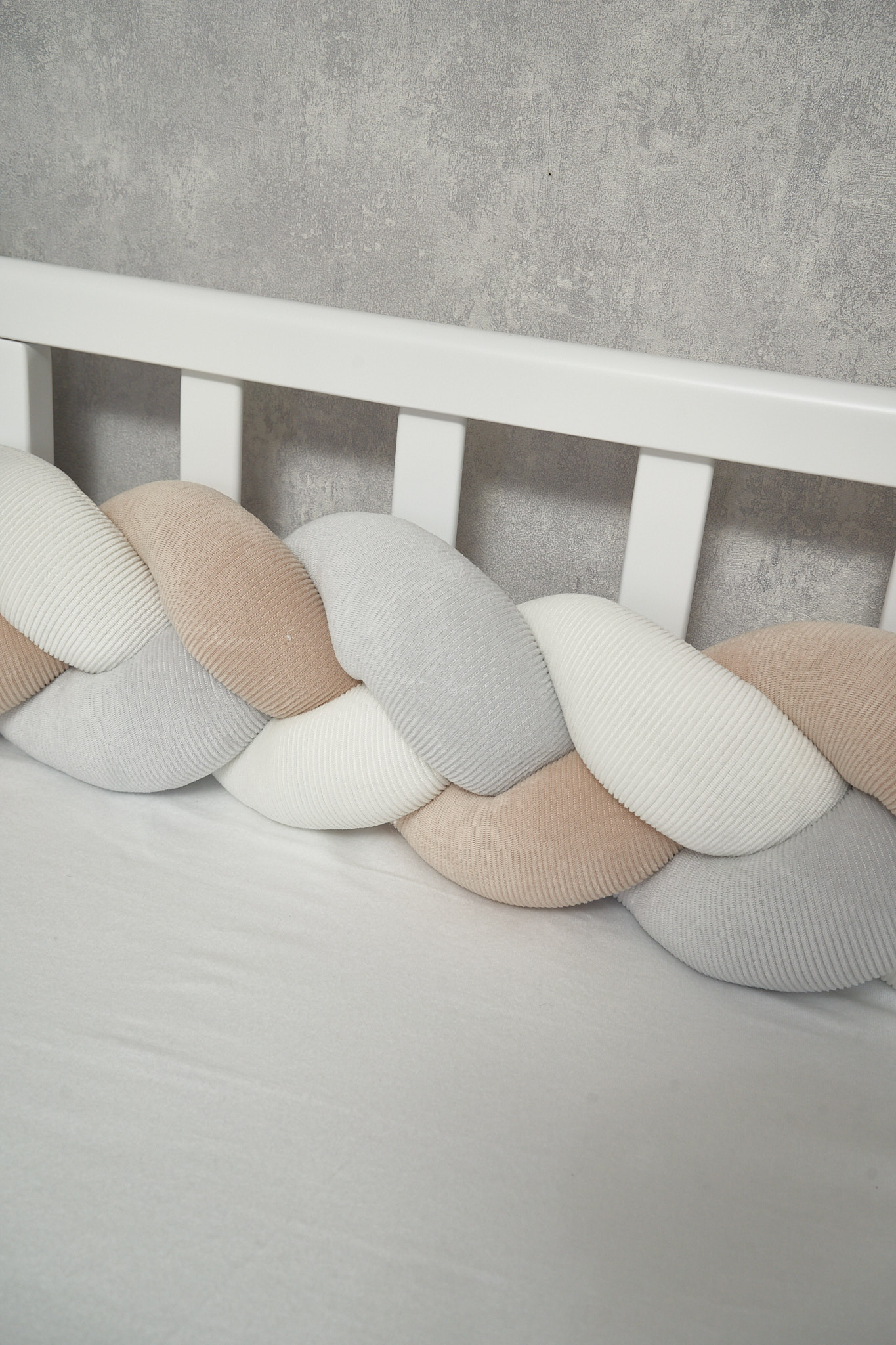 Верх бампера ー хлопковый велюр, приятный на ощупь и безопасный для новорожденных малышей, а ведь они очень любят играть с косичкой.