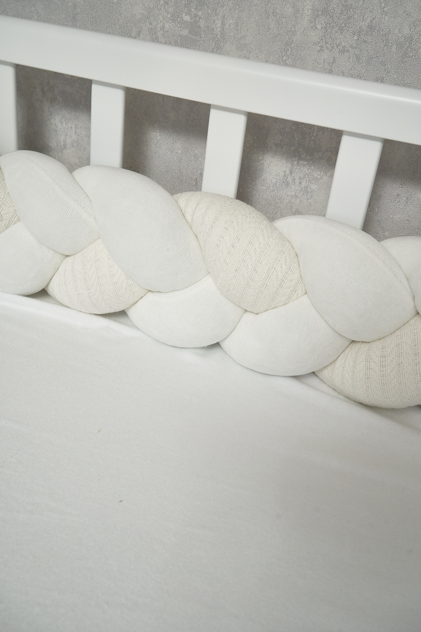 Верх бампера ー хлопковый велюр и хлопок с вязаной структурой, приятный на ощупь и безопасный для новорожденных малышей, а ведь они очень любят играть с косичкой.