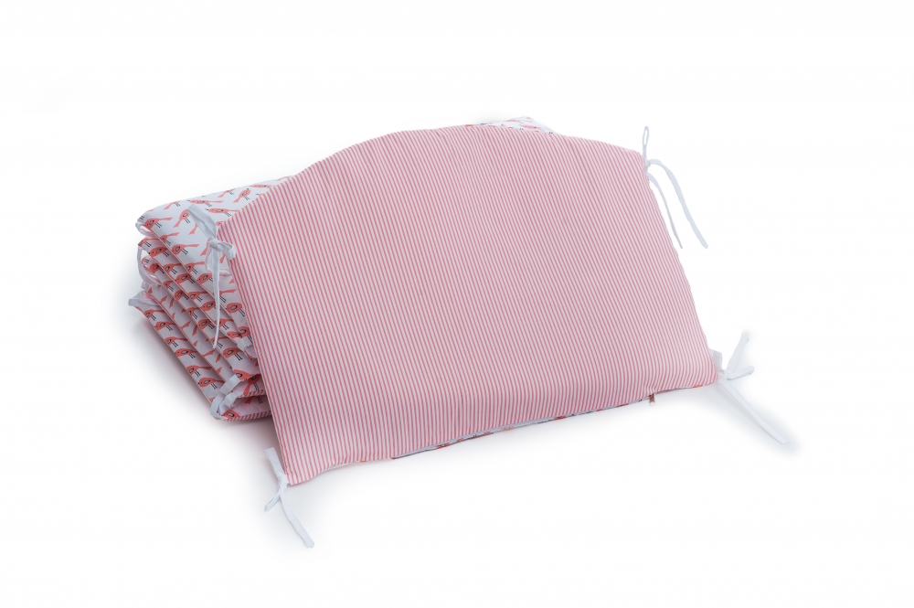Бортик состоит из 6 частей, которые легко крепятся завязками к кровати, что делает его максимально удобным в использовании.