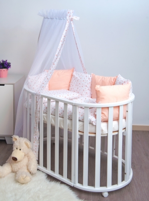 Комплект подойдет для детской кроватки с размером спального места 120 * 60 см, а также детских кроваток круглой и овальной конструкции.