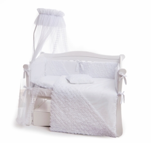 Воздушная вышывка и рюшки на совершенном белом сатине станут самым романтичным дополнением спального места новорожденного.