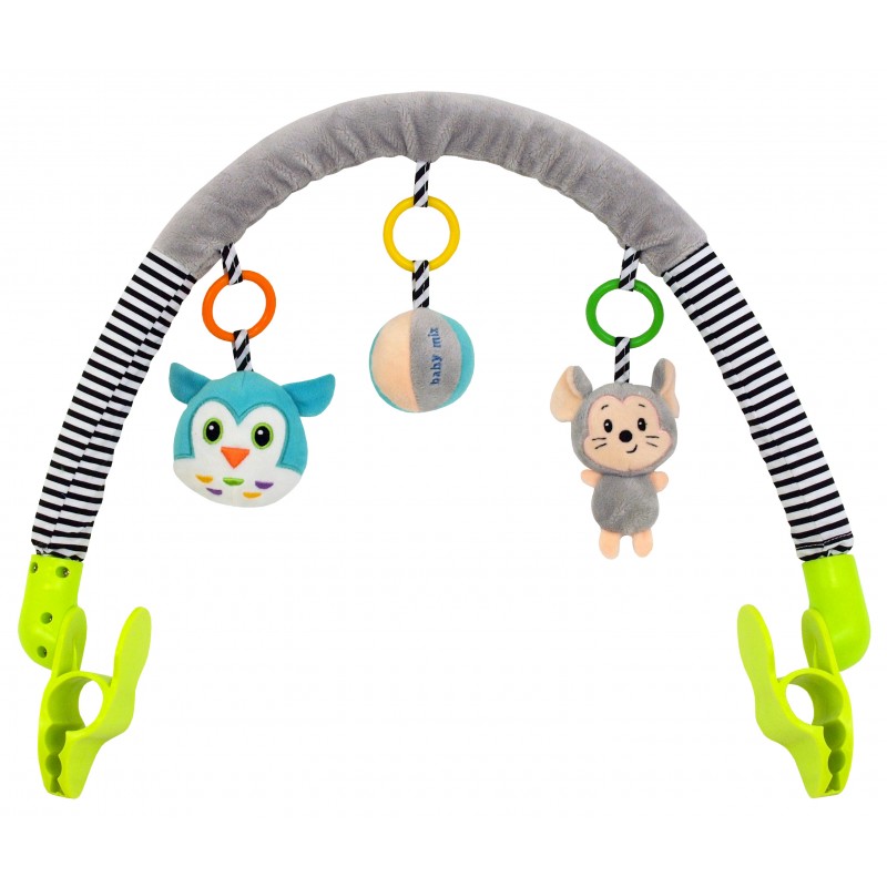Мягкая и приятная на ощупь дуга для коляски с игрушками точно понравится Вашему малышу! Яркие цвета привлекают внимание ребенка, он учится лучше концентрировать внимание, развивает зрительное восприятие. На краях дуги содержатся специальные прищепки, с помощью которых дуга отлично крепится к любой коляске. С такой игрушкой малыш точно не будет скучать во время прогулки. Игрушки в виде зверюшек, изготовленные из качественного текстиля, съемные и могут использоваться отдельно.