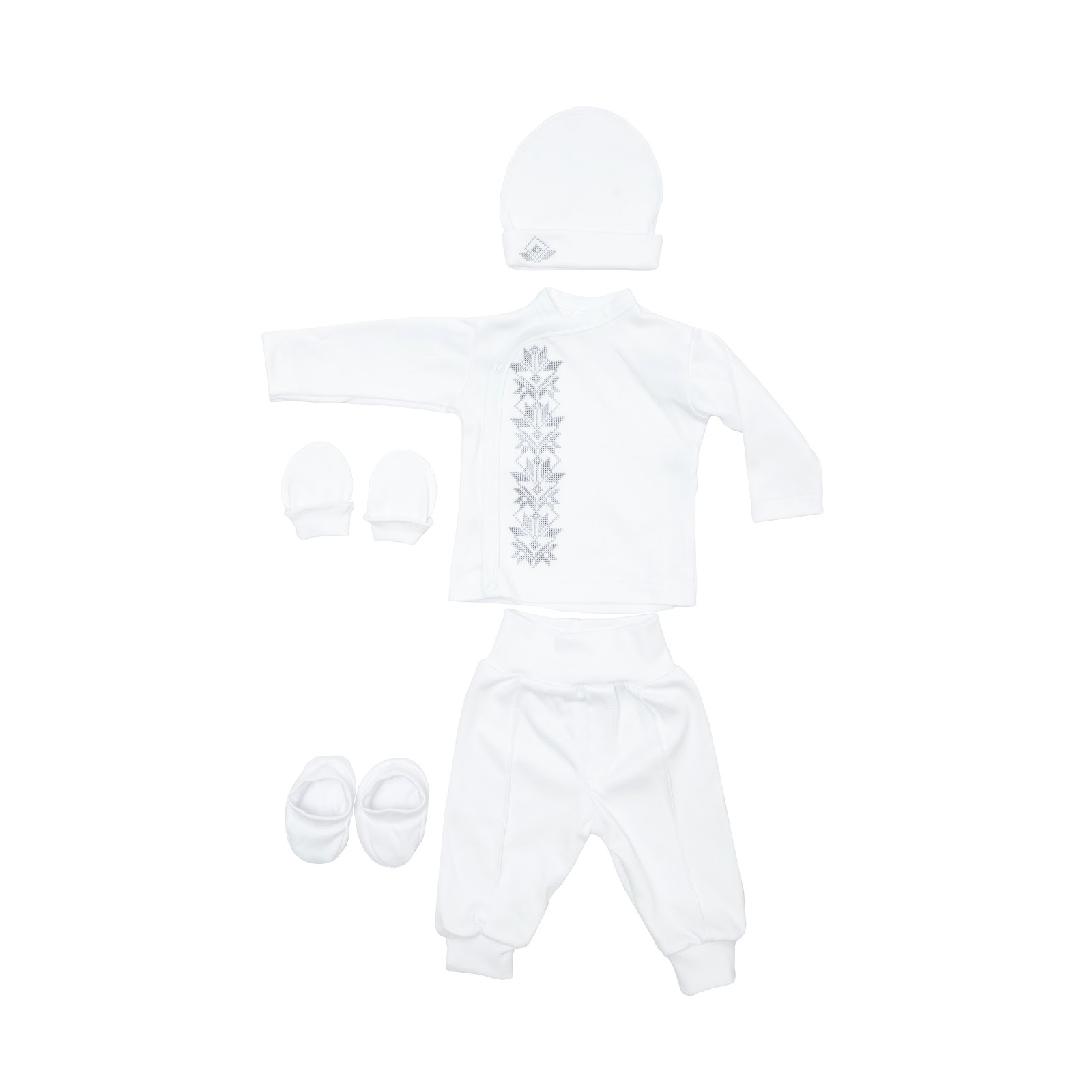 Набор изготовлен из мягкого интерлока (95% хлопок 5% эластан) - дышащей, приятной к телу ткани, которая обеспечивает максимальный комфорт для малыша на протяжении всей церемонии.