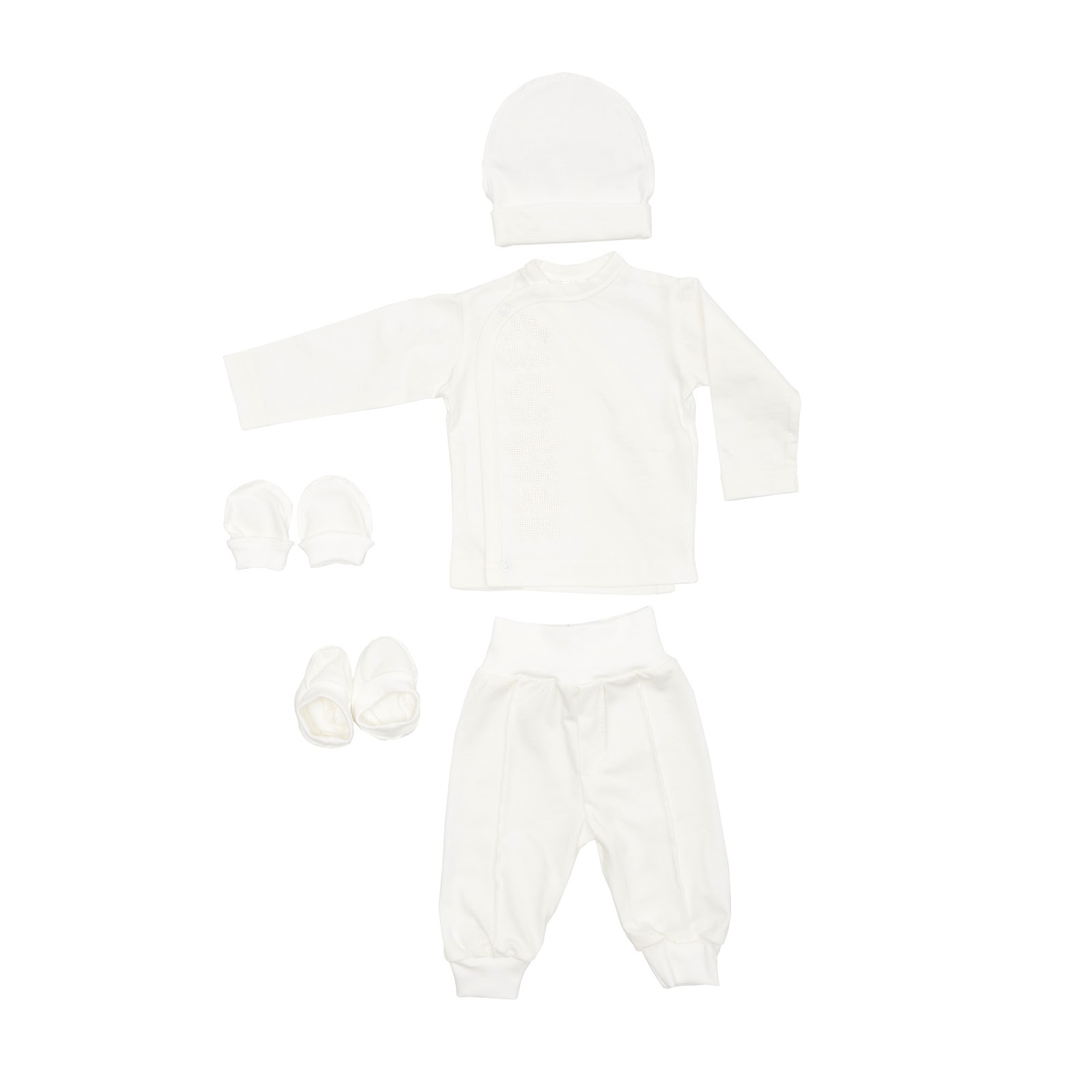 Набор изготовлен из мягкого интерлока (95% хлопок 5% эластан) - дышащей, приятной к телу ткани, которая обеспечивает максимальный комфорт для малыша на протяжении всей церемонии.