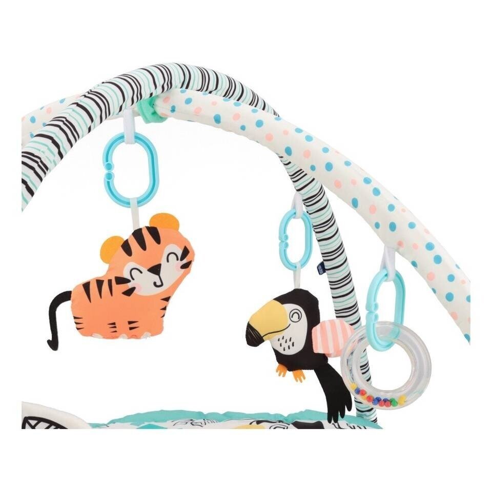Красочный коврик из мягкого велюра привлекает внимание ребенка и учит распознавать формы, развивает координацию глаз. Мягкие игрушки, погремушки, прорезыватели, крепящиеся к ковру, съемные, поэтому их можно использовать отдельно.