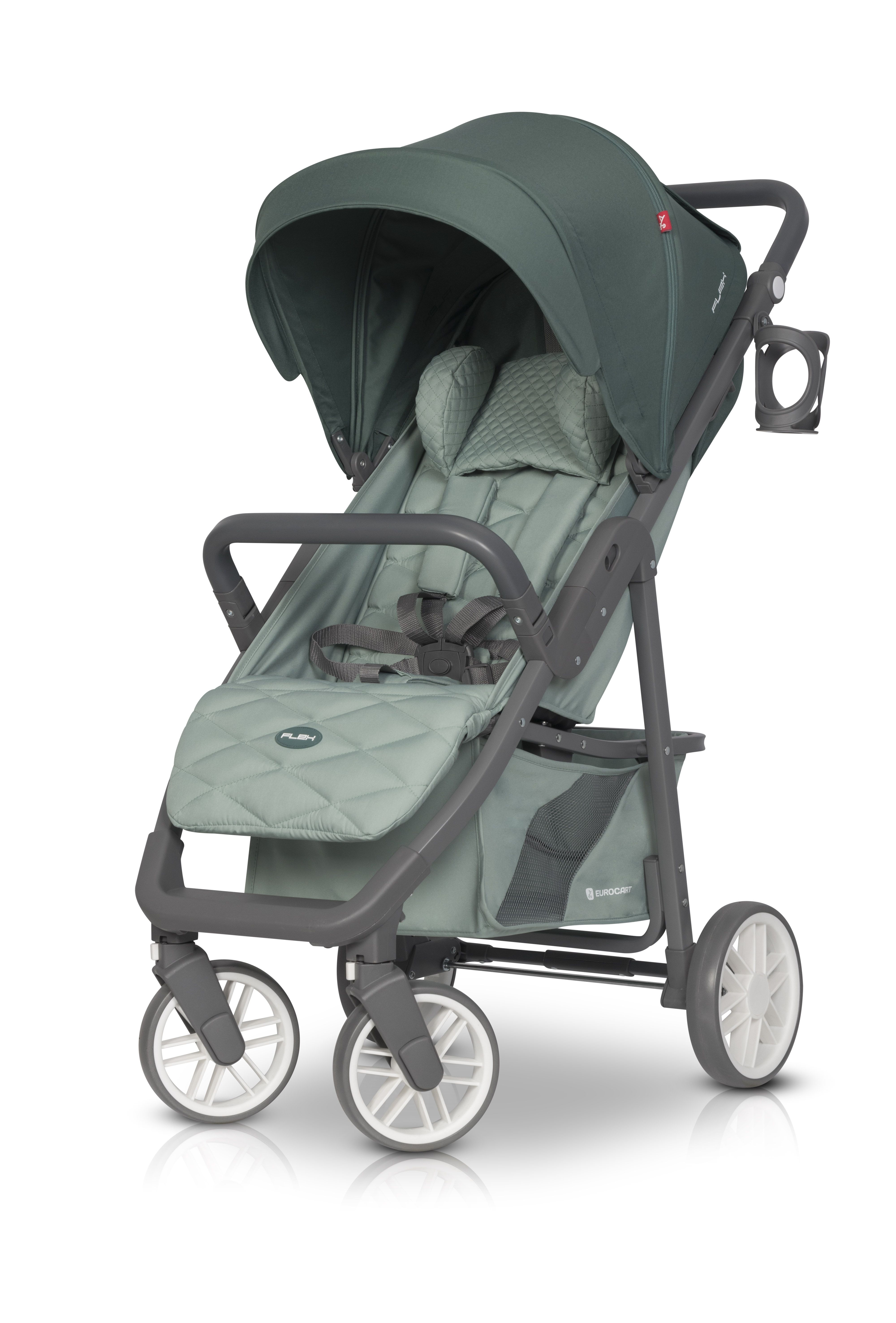 Современная прогулочная детская коляска Euro-Cart Flex идеальна для детей в возрасте от 6 мес до 22 кг. Качественные и прочные материалы, практичность в каждой детали обращают на себя внимание. Удобное сиденье из приятных на ощупь материалов, что обеспечит комфорт ребенку во время путешествий. Возможность регулирования наклона сиденья и регулировка подножки позволит приспособиться к текущим потребностям малыша. Сидение оснащено 5-ти точечными ремнями безопасности с возможностью регулировки их длины и высоты, чтобы максимально соответствовать по размерам малышу, который растет. Противоударная подушка позаботится о правильном положении головы ребенка во время использования коляски, увеличивая комфорт во время вождения. Просторный капюшон имеет встроенную дополнительную панель, что позволяет ее удлинение и солнцезащитный козырек. Также присутствует вентиляционное окно. Кроме того, карман для мелких вещей установлен в задней части коляски. Так вы всегда имеете ключи или телефон под рукой. Рама изготовлена из легкого алюминия в сочетании с пластиком, также регулируемая ручка и защитный съемный бампер покрыты нескользящим материалом, что значительно упрощает управление одной рукой. Важно отметить высокую функциональность коляски за счет складывания вместе с капюшоном и барьером. Передние колеса поворотные, с возможностью блокировки для движения вперед, и амортизацией значительно облегчают движение по неровным поверхностям. Центральный тормоз. Благодаря своей функциональности, коляску можно сложить одной рукой. После складывания коляска блокируется, что облегчает ее транспортировку.