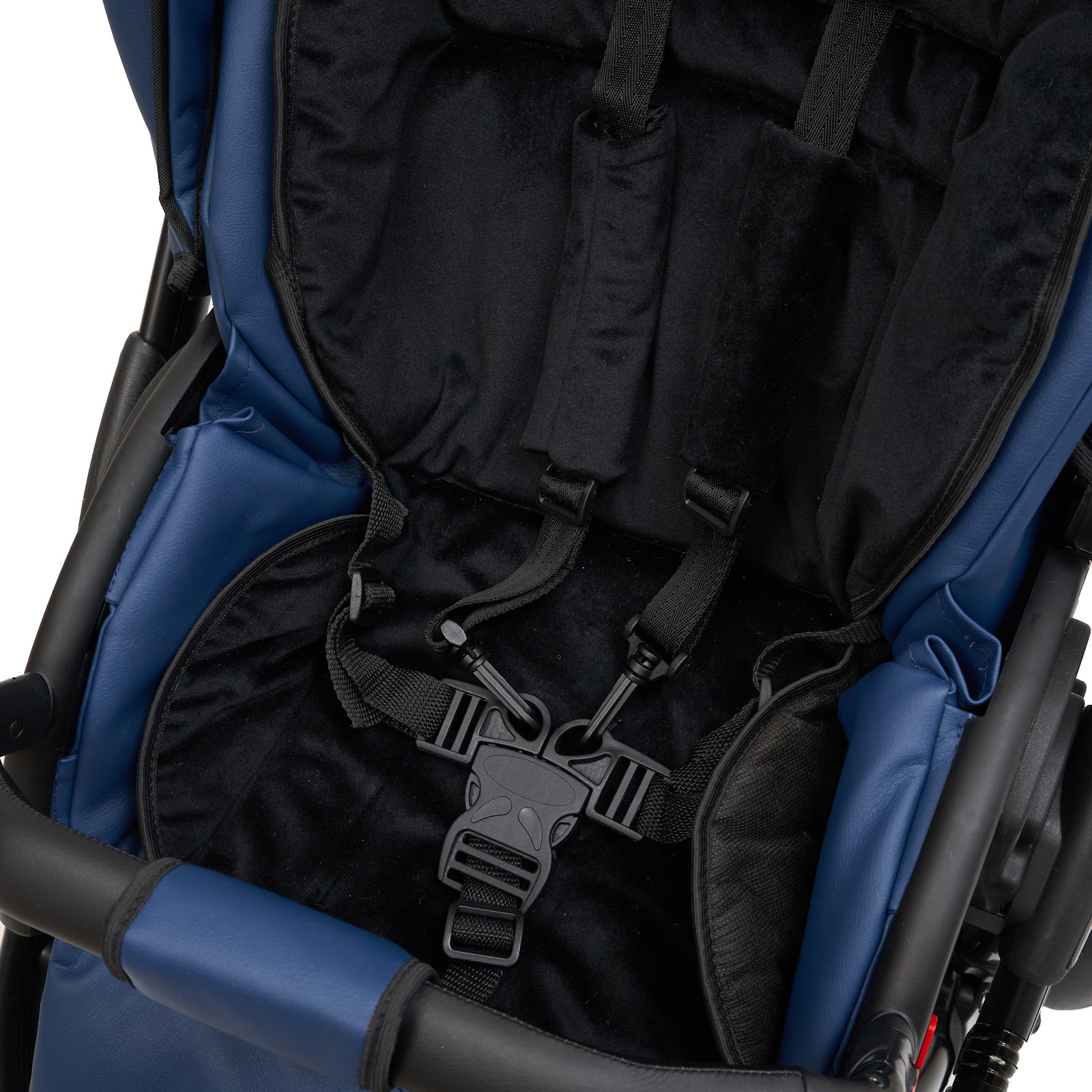 Благодаря легкой алюминиевой раме, гелиевым колесам и покрытию из эко-кожи, она выглядит роскошно и обеспечивает максимальный комфорт как для малыша, так и для родителей.