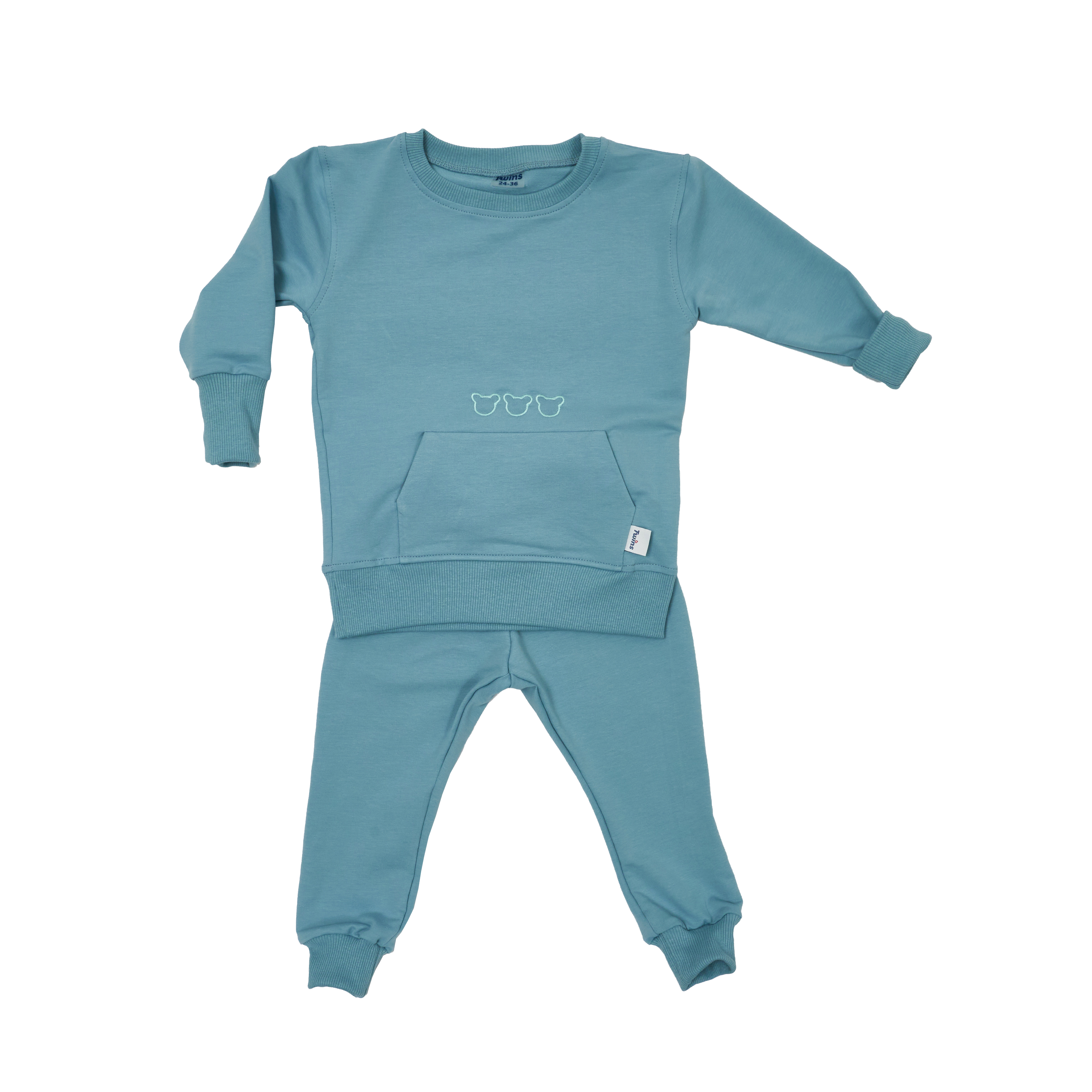 Комплект состоит из кофты с карманом и вышивкой, а также штанишек на мягкой резинке, которая не давит на животик.