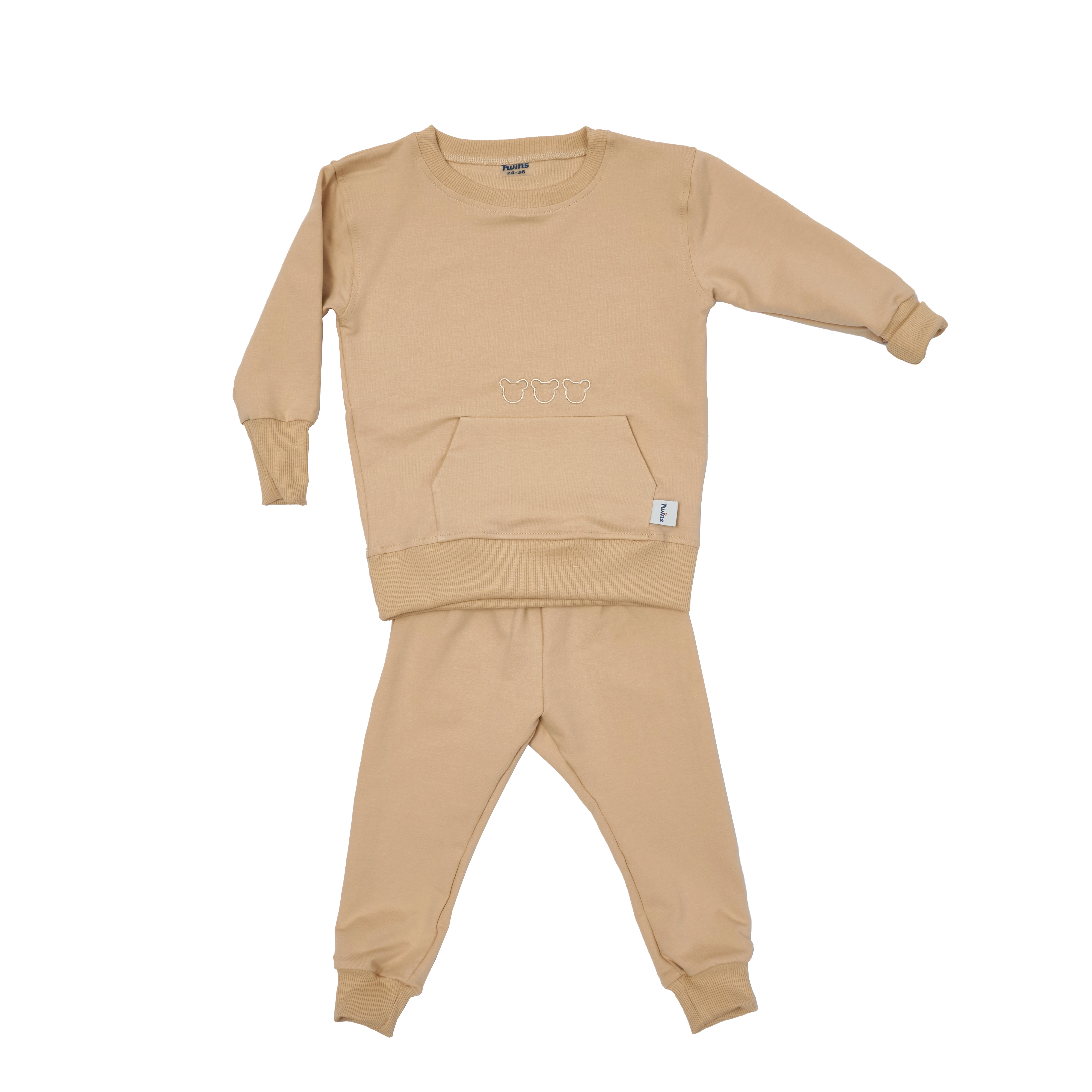 Комплект состоит из кофты с карманом и вышивкой, а также штанишек на мягкой резинке, которая не давит на животик.