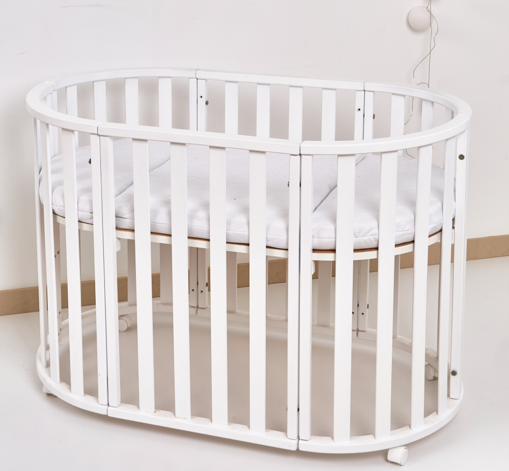 Круглая кроватка для новорожденного (670 х 670 мм), овальное кроватку для ребенка возрастом до 4 лет (670 х 1170 мм), подростковая кровать (670 х 1670 мм), манеж, пеленатор с полкой, два стула и столик с полкой - это все входит в набор комплектации. К тому же при желании можно заказать дуги (+250 грн) или маятниковый механизм для качания и матрас с натуральным наполнением (лен, кокос, войлок), который идеально подходит ко всем вариантам кроватки. Овальное кроватка - отличный выбор для современных вечно занятых родителей: ребенок всегда может находиться вместе с вами, будучи одновременно в своей удобной кроватке, ведь благодаря встроенным колесикам и габаритам и форме кровати, его можно с легкостью перемещать по вашему дому и установить в любом удобном месте.