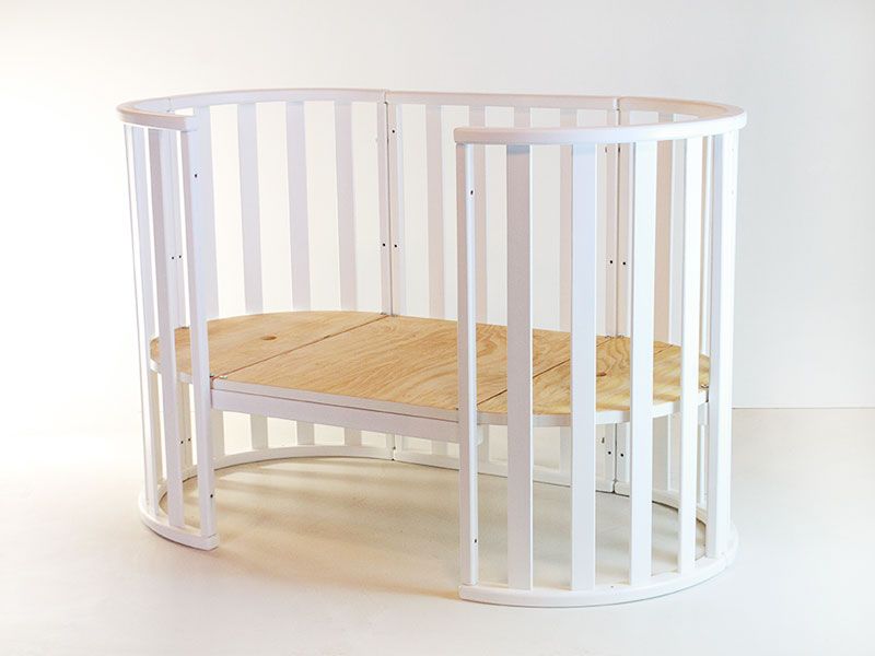 Круглая кроватка для новорожденного (670 х 670 мм), овальное кроватку для ребенка возрастом до 4 лет (670 х 1170 мм), подростковая кровать (670 х 1670 мм), манеж, пеленатор с полкой, два стула и столик с полкой - это все входит в набор комплектации. К тому же при желании можно заказать дуги (+250 грн) или маятниковый механизм для качания и матрас с натуральным наполнением (лен, кокос, войлок), который идеально подходит ко всем вариантам кроватки. Овальное кроватка - отличный выбор для современных вечно занятых родителей: ребенок всегда может находиться вместе с вами, будучи одновременно в своей удобной кроватке, ведь благодаря встроенным колесикам и габаритам и форме кровати, его можно с легкостью перемещать по вашему дому и установить в любом удобном месте.