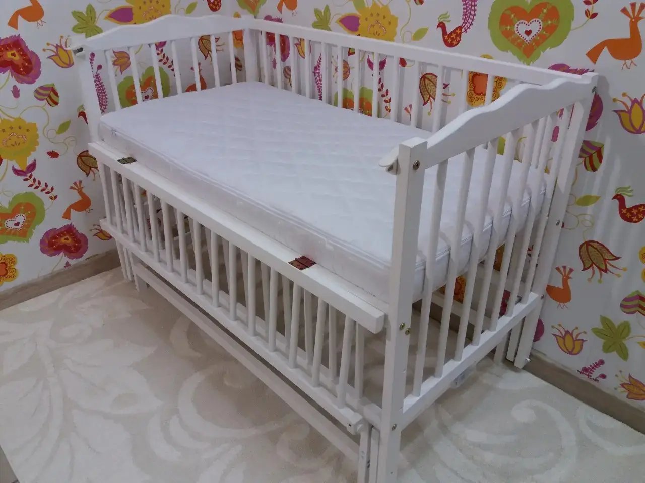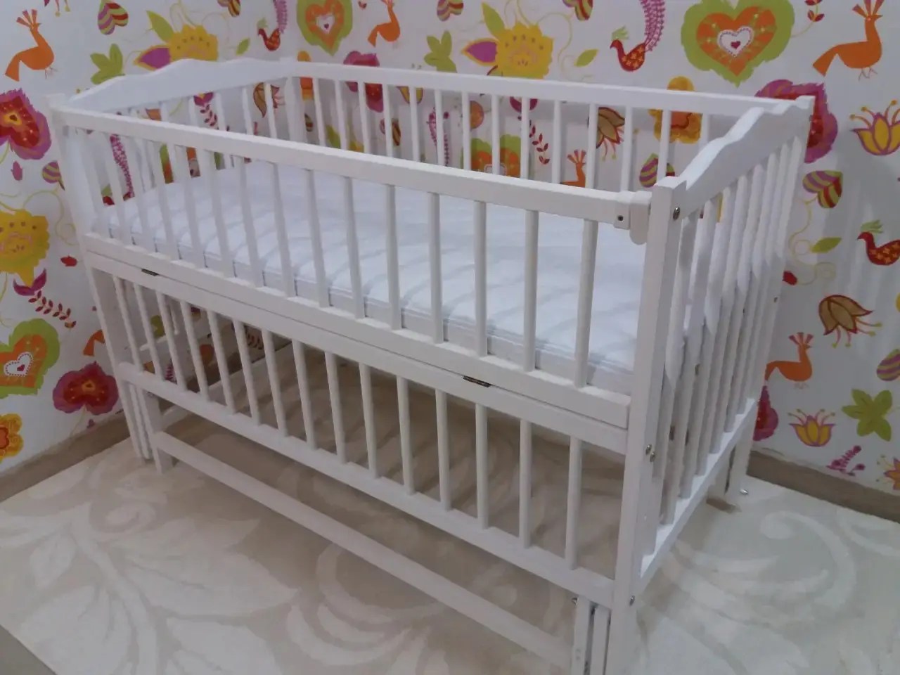 Кровать ТМ Дубик-М Радуга изготовлена из древесины бука, крепкого и долговечного материала. Внутренний размер 120х60 см (с рождения до трех лет). Кроватка оборудована самым простым и надежным механизмом откидной боковины, позволяющим бесшумно опускать и поднимать боковую часть кроватки.