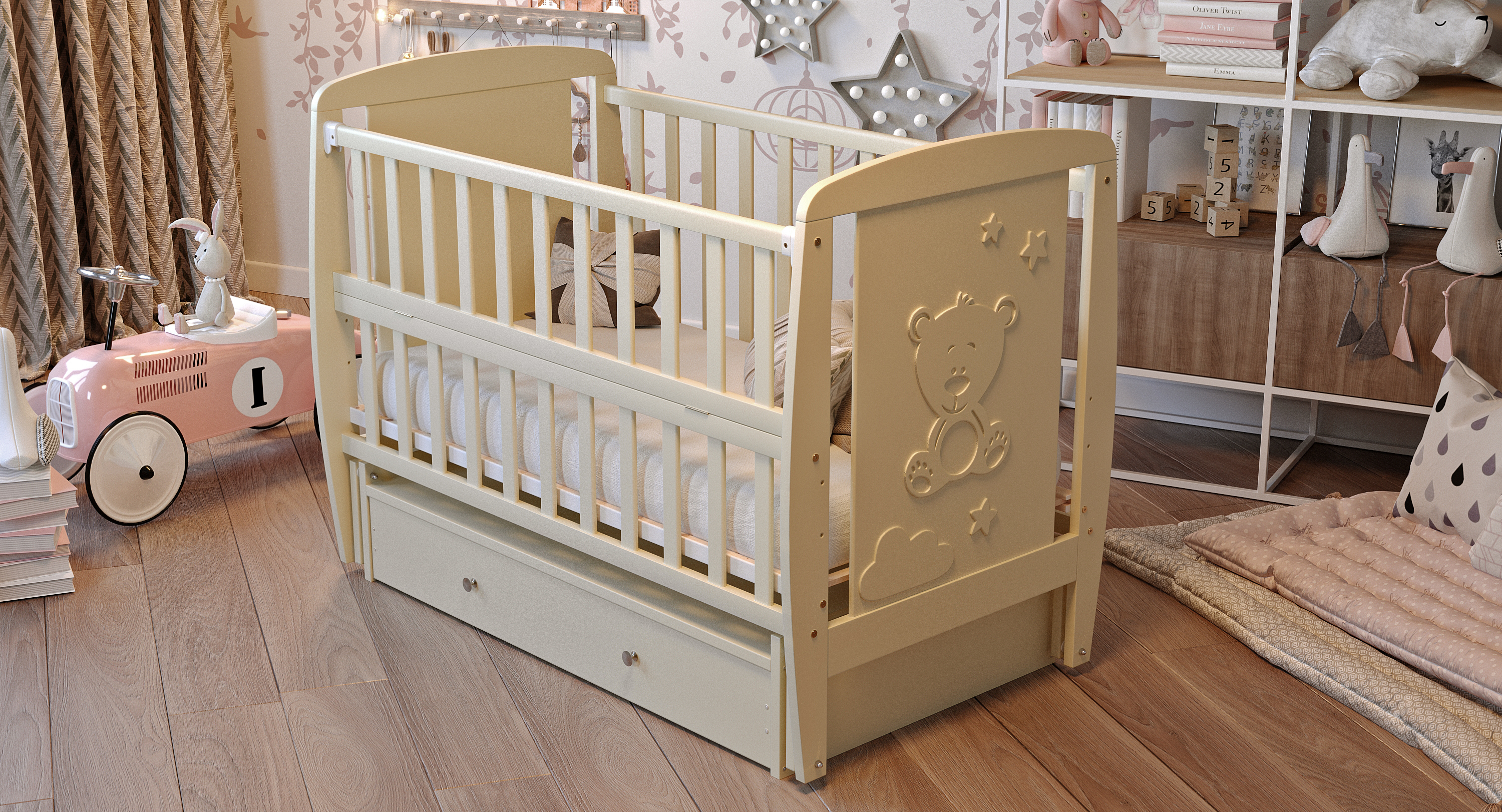 Доступно в трех стильных цветах: белый, слоновая кость, серый - легко впишется в любой интерьер детской комнаты.