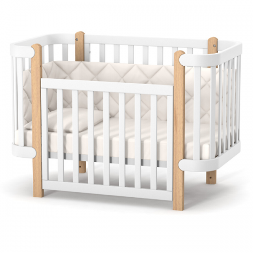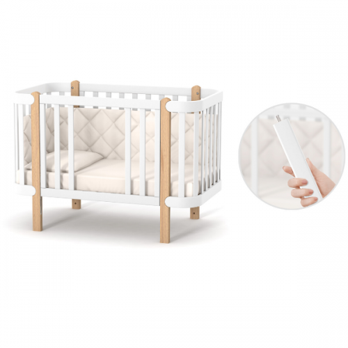 * Съёмные спицы: когда ребенок достаточно подрастет, можно вытянуть 3 центральные спицы, обезопасив своего ребенка от риска падения с высоты ограждения при попытке самостоятельно выбраться из кроватки. Через созданный вытянутыми спицами безопасный проём ребенок сможет самостоятельно покидать и возвращаться в кроватку.