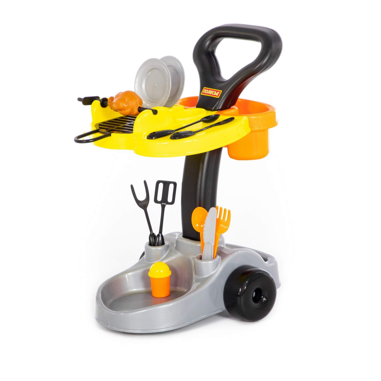 Набор для барбекю на тележке включает: решетку, приборы для гриля (4 шт.), солонку, вертел с курочкой, ложку, вилку, нож, 2 блюдца.