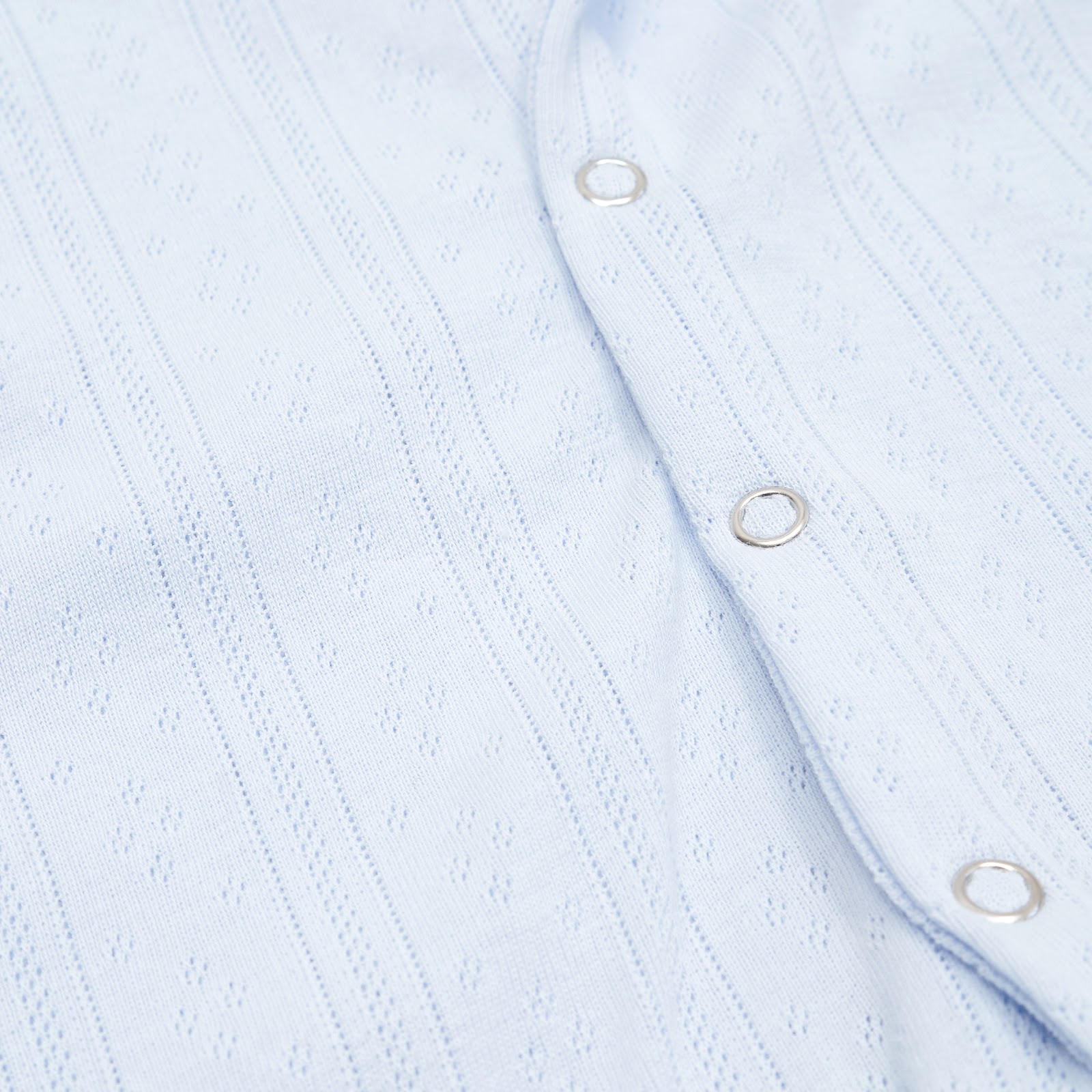 Все швы вывернуты наружу, чтобы не раздражать нежную кожу ребенка. Застежка на кнопки по всей длине позволяет легко переодевать малыша без лишнего дискомфорта.