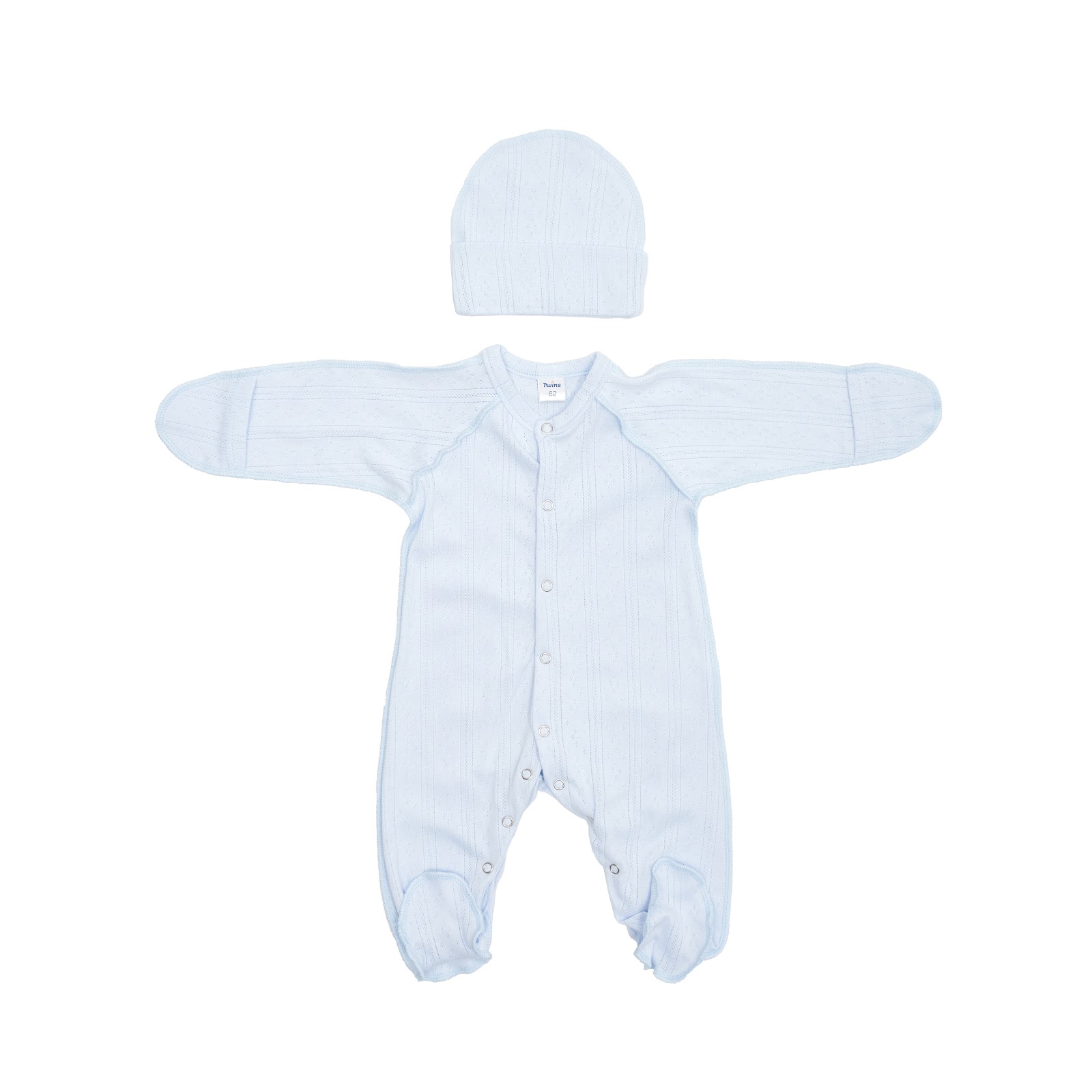 Мягкий и удобный набор для младенца, состоящий из человечка с длинным рукавом и шапочки, изготовлен из интерлока с перфорацией - дышащей натуральной ткани (95% хлопок, 5% эластан).