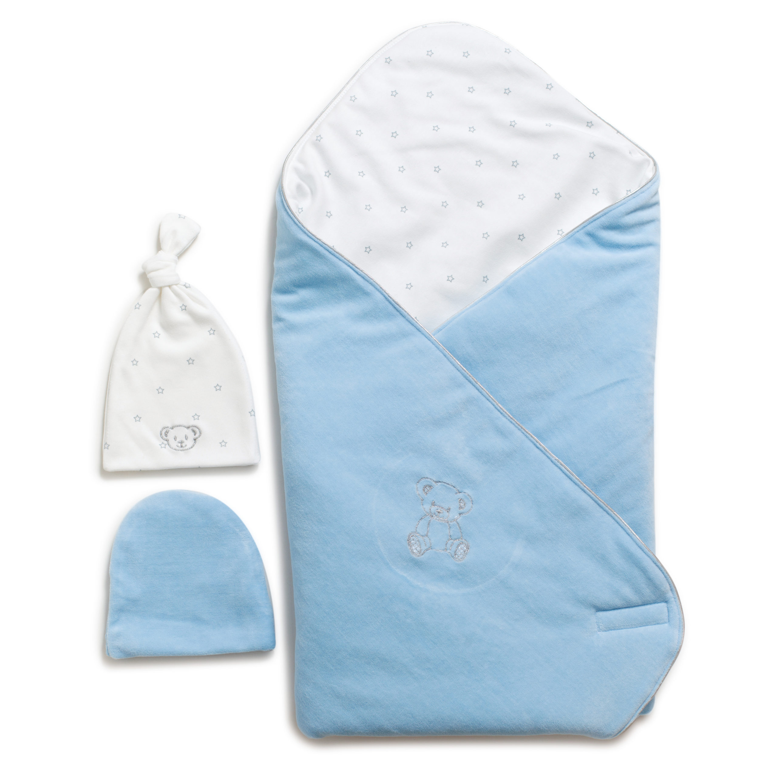 - Комплектация: плед-конверт + 2 шапочки