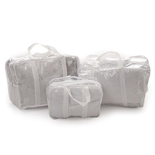 В комплект входят три прозрачные сумки разного размера, которые помогут организовать одежду для мамы, вещи для новорожденного и средства гигиены.