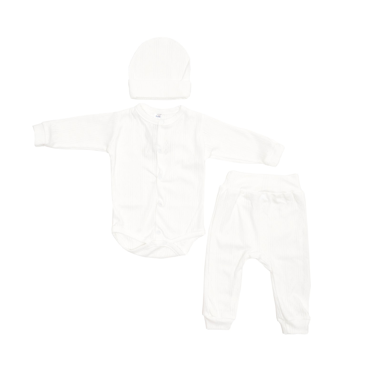 Практичный и стильный набор одежды для новорожденного от Twins состоит из трех элементов: боди с длинным рукавом, штанишек и шапочки.