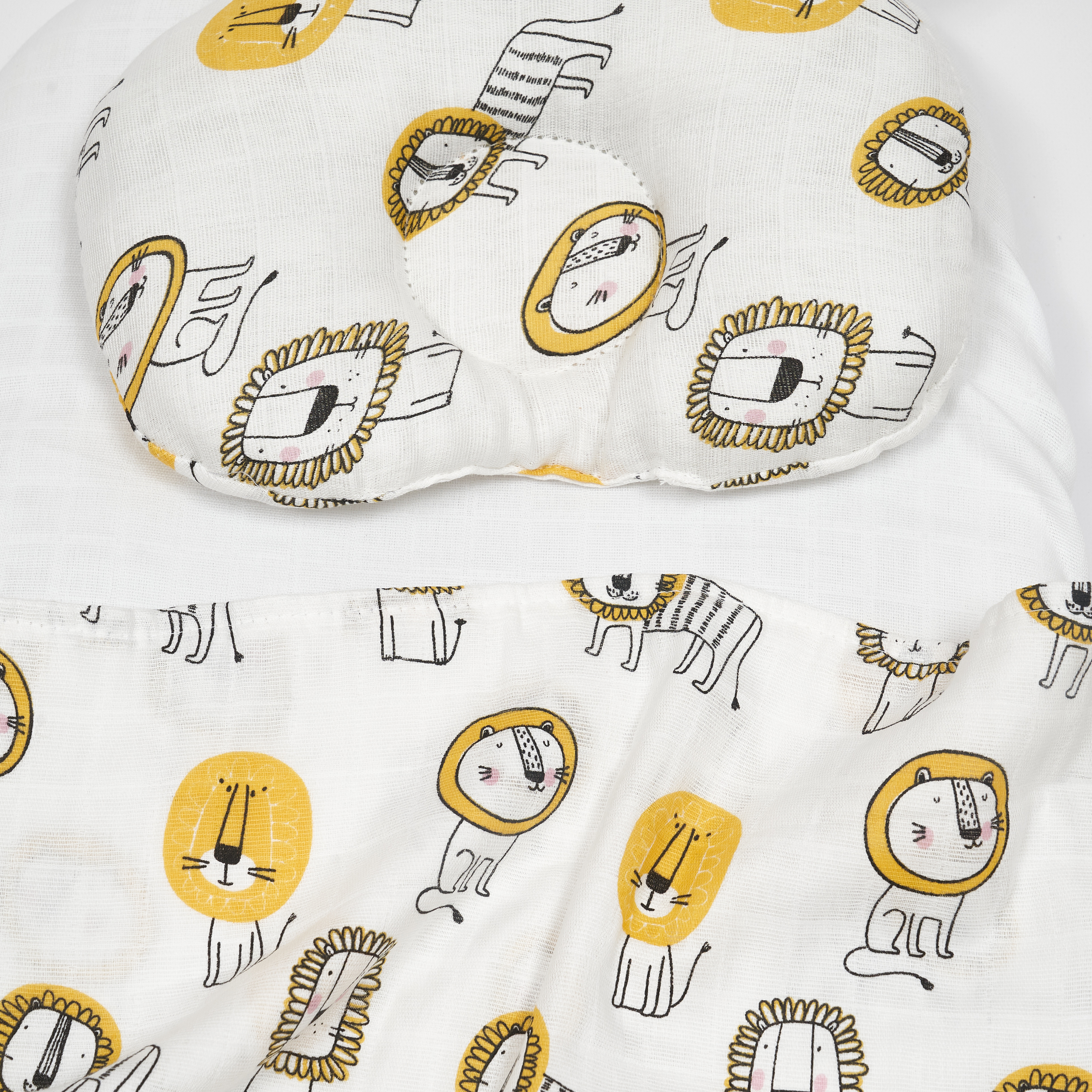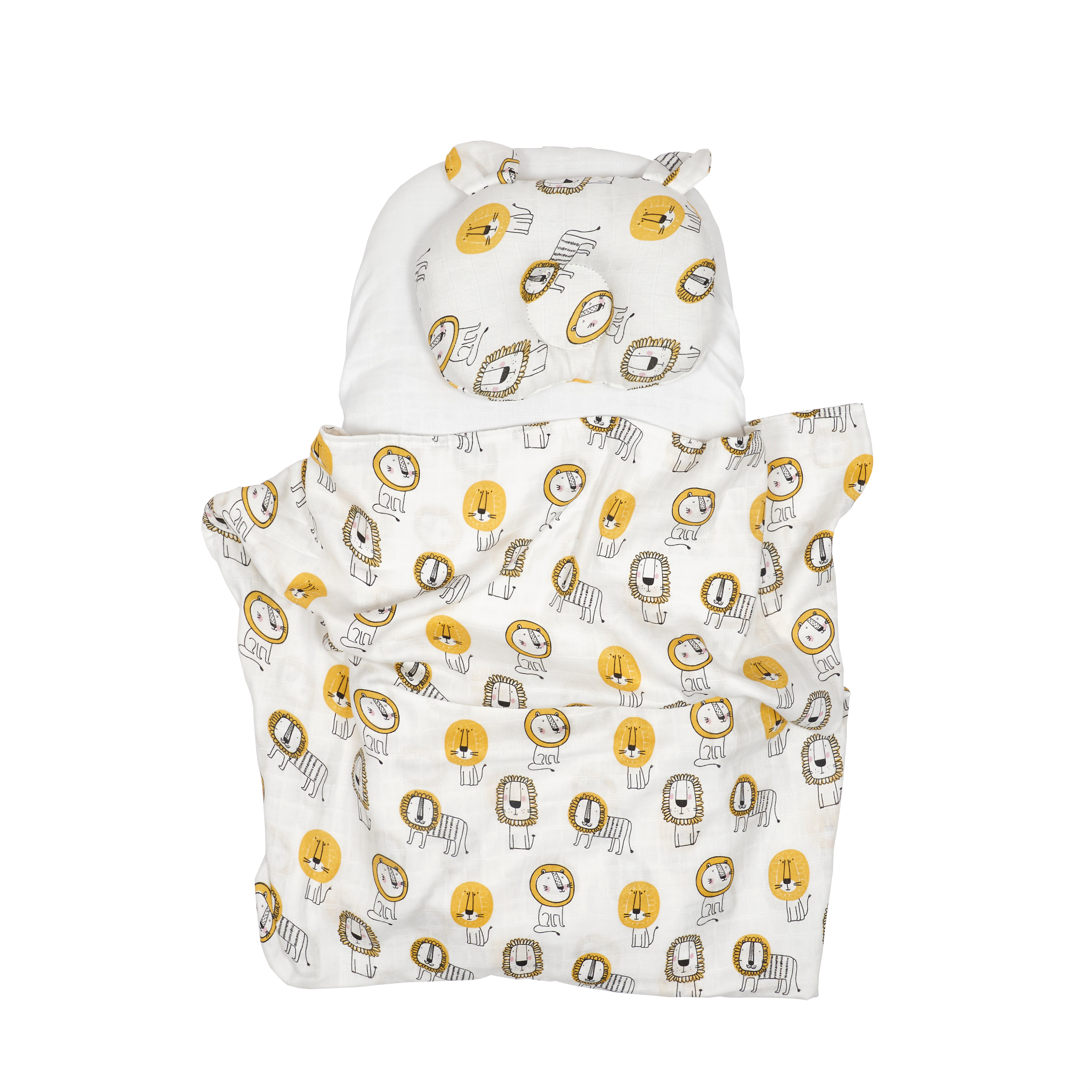 Набор в коляску Twins Bear изготовлен из муслина и включает в себя 3 элемента: плед, подушку и наматрасник на резинке для матраса в коляске. Размер элементов универсален и подойдет для любой стандартной коляски. Удобная подушка в форме мишки позволит малышу комфортно чувствовать себя во время прогулки, крепко спать на свежем воздухе.