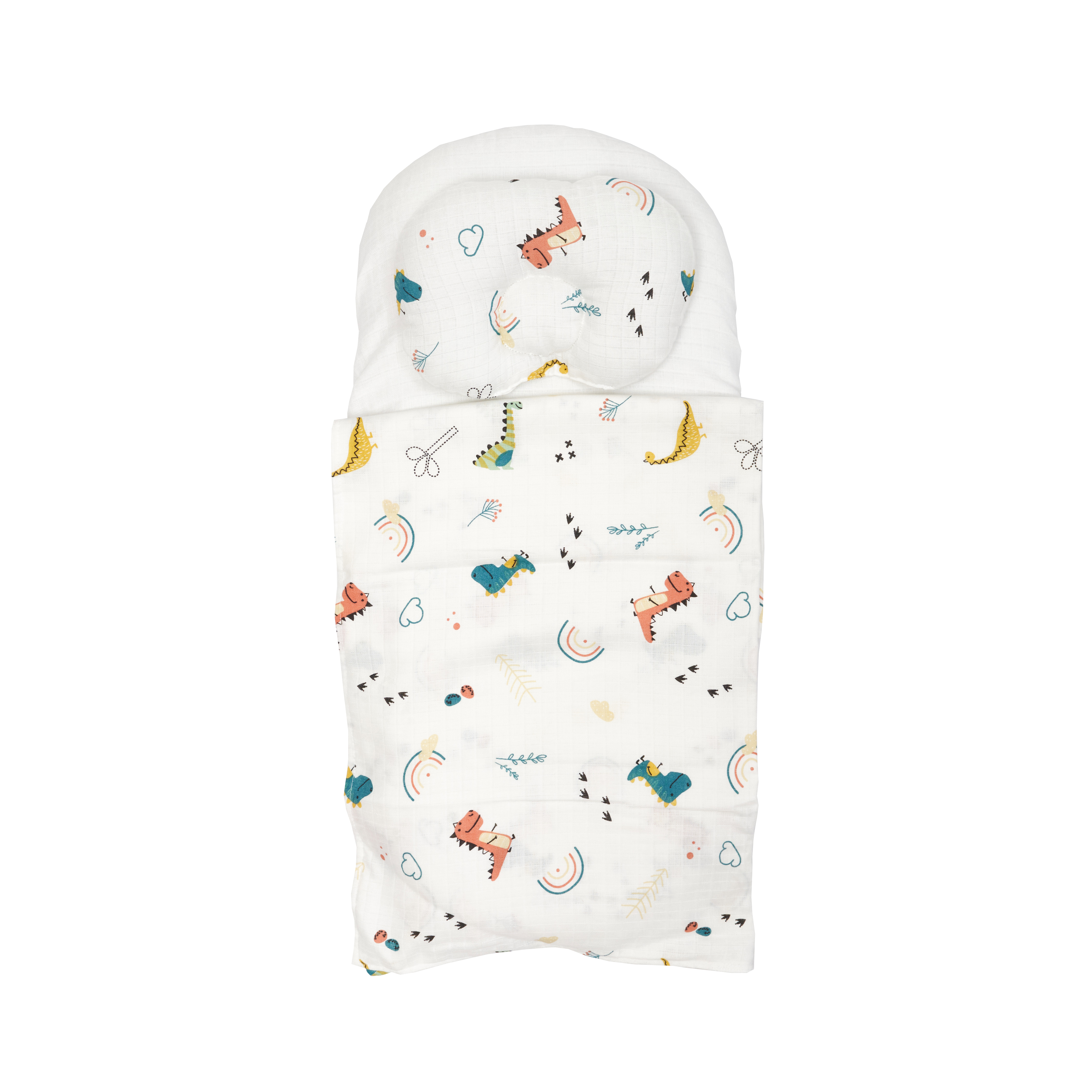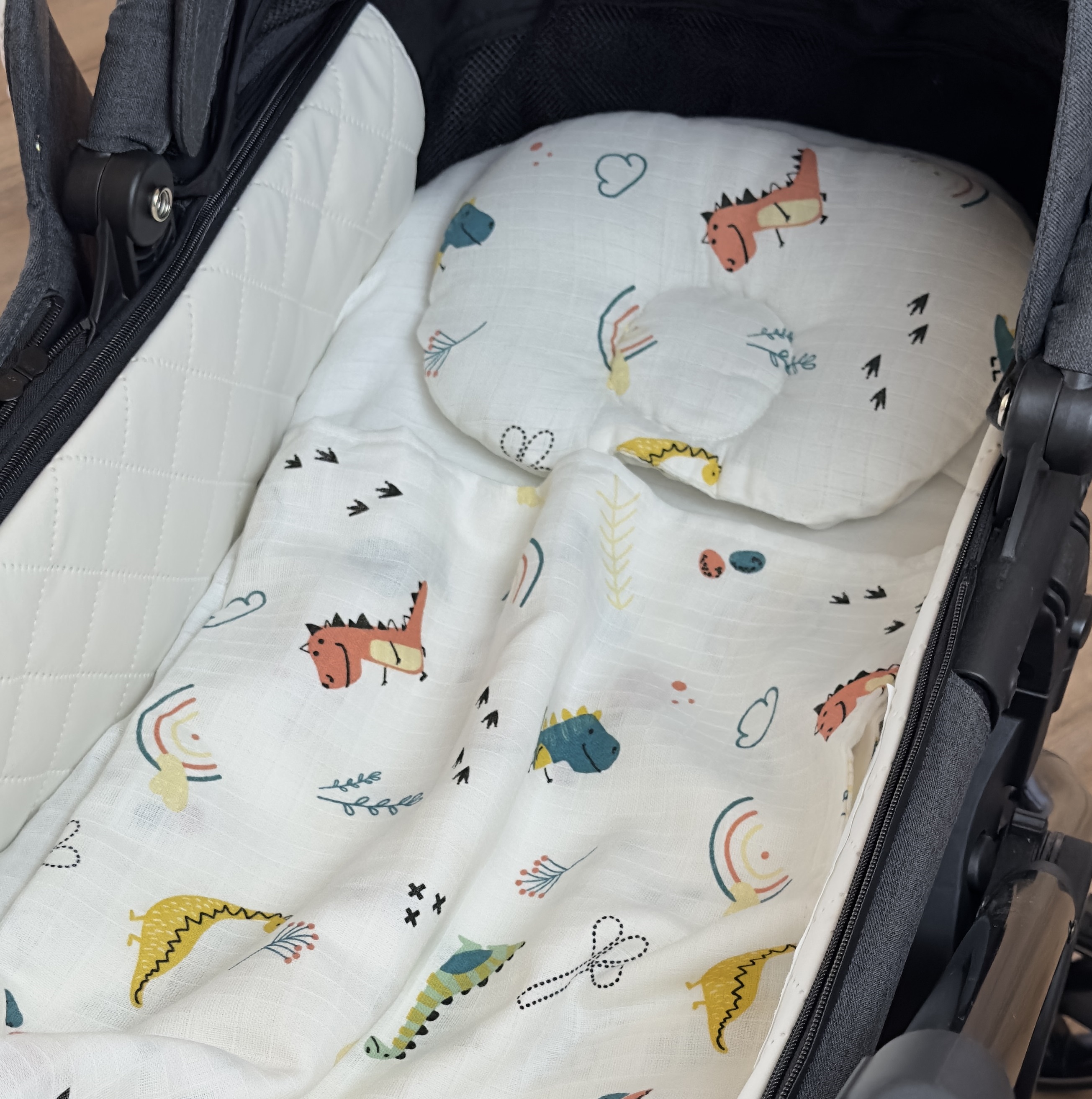 Легкая подушка обеспечивает правильную поддержку головки, а мягкий муслиновый плед укроет ребенка от солнца или прохлады.