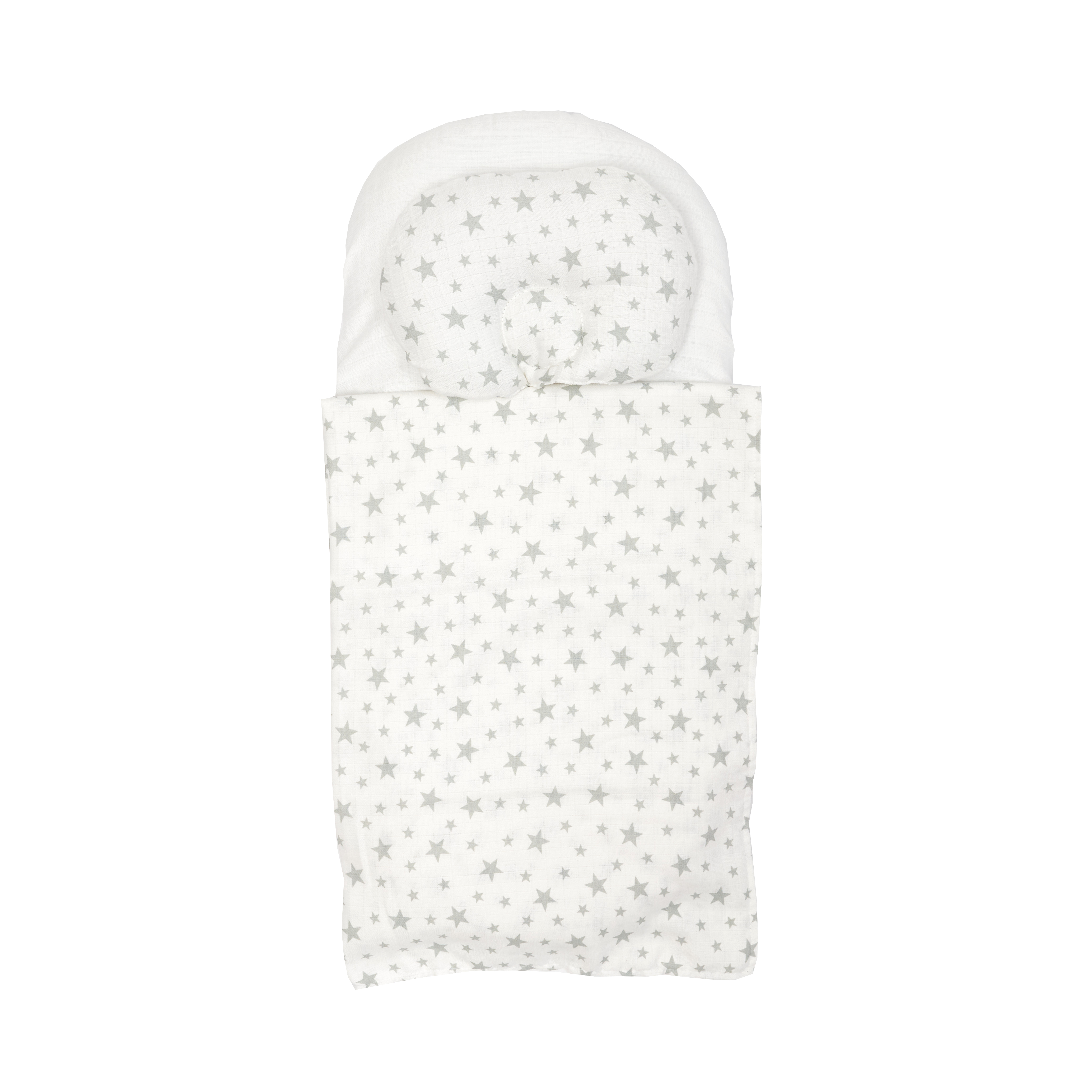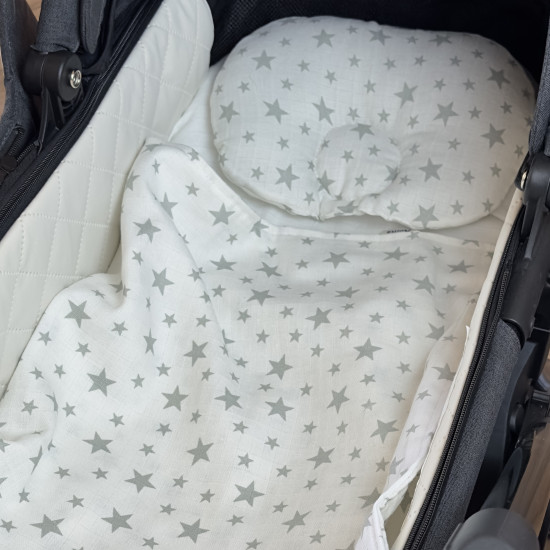 Легкая подушка обеспечивает правильную поддержку головки, а мягкий муслиновый плед укроет ребенка от солнца или прохлады.