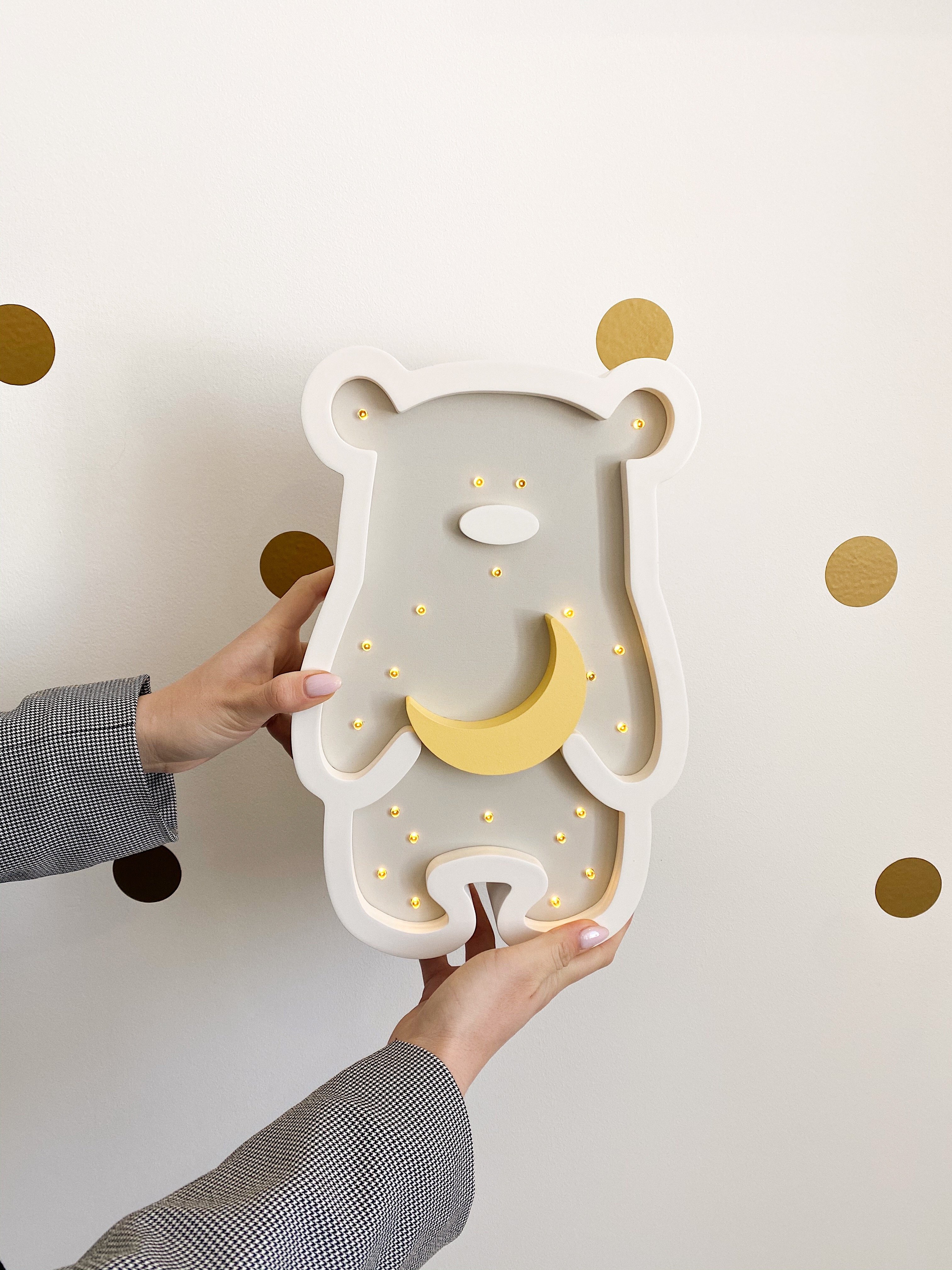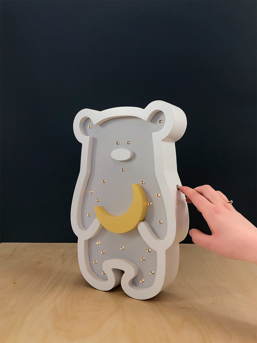 Просто представьте себе ночное небо, усеянное звездами. Спокойная, тихая ночь и малыш сладко спит. Красота, правда же? Так и хочется, чтобы это не прекращалось. Как же захватить частичку звездного неба в детскую комнату? На помощь придет Ночник Sabo Мишка. Совершенный минималистичный дизайн и деликатный мягкий свет сделают ваш интерьер по-настоящему особенным. Ночник оснащен LED-лампочками, которые дают не слишком яркий свет, чтобы не тревожить детский сон. А родителям будет достаточно света, чтобы можно было удобно и тихо подойти к своей крохи ночью.