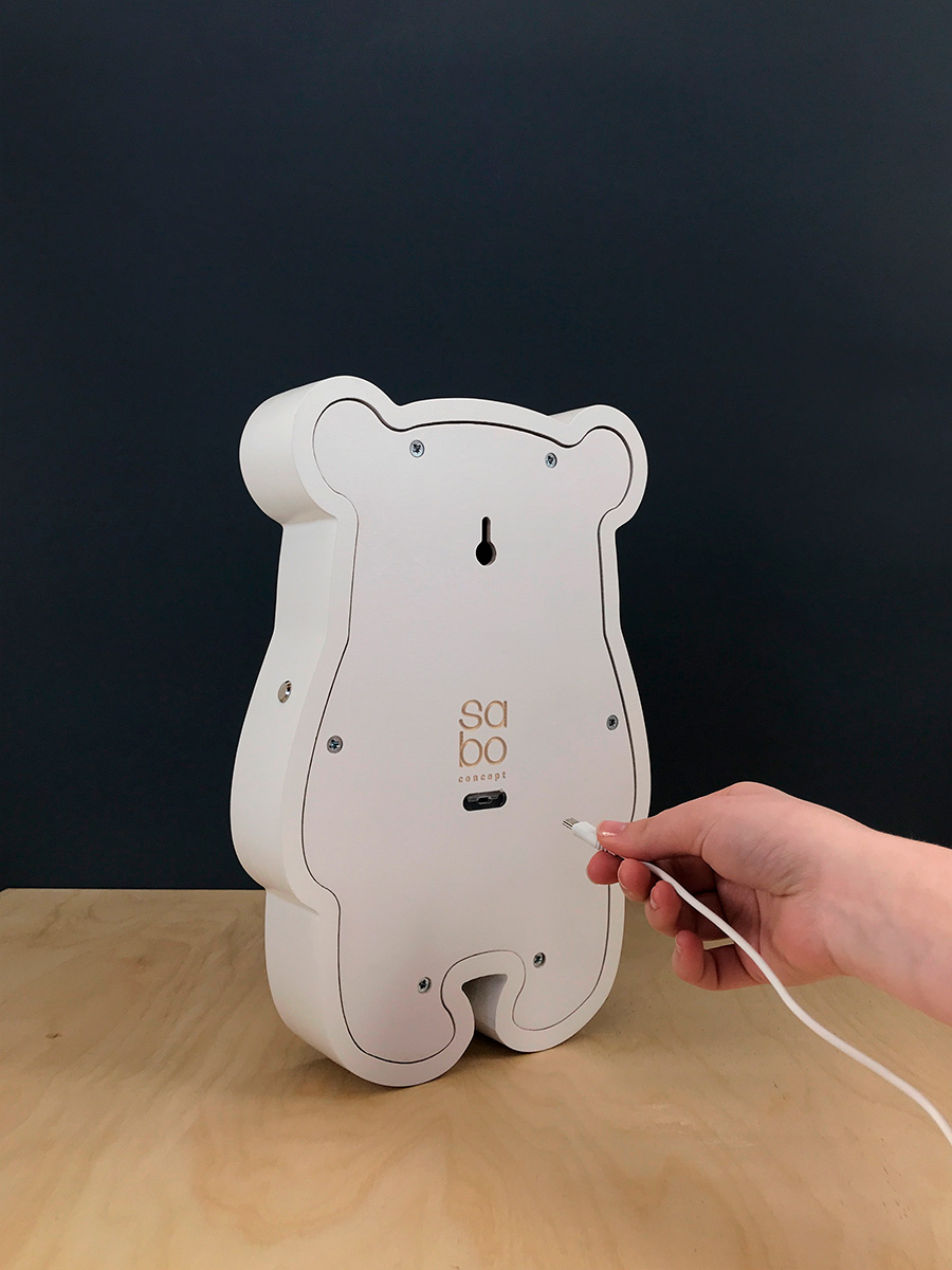 Сзади ночника Sabo Мишка есть петелька для надежного крепления на стену. Его можно поставить на комод, однако лучше всего будет смотреться все-таки в подвешенном состоянии. В комплекте — надежный кабель для зарядки аккумуляторов. Внешняя панель ночника сделан из фанеры, которая покрыта качественной краской на водной основе. Такой правильный подбор материалов не вызывает никаких вредных испарений, поэтому такой ночник безопасен в детских комнатах, где растут новорожденные малыши.