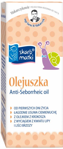 Антисеборейное масло польского бренда аптечной косметики Skarb Matki поможет мягко и эффективно решить проблему «молочных» корочек на голове малыша. Формула средства включает вазелиновое масло и натуральные природные компоненты: сафлоровое и подсолнечное масло, экстракты листьев березы и цветков липы. Безопасность продукта подтверждена клиническими и дерматологическими тестами.