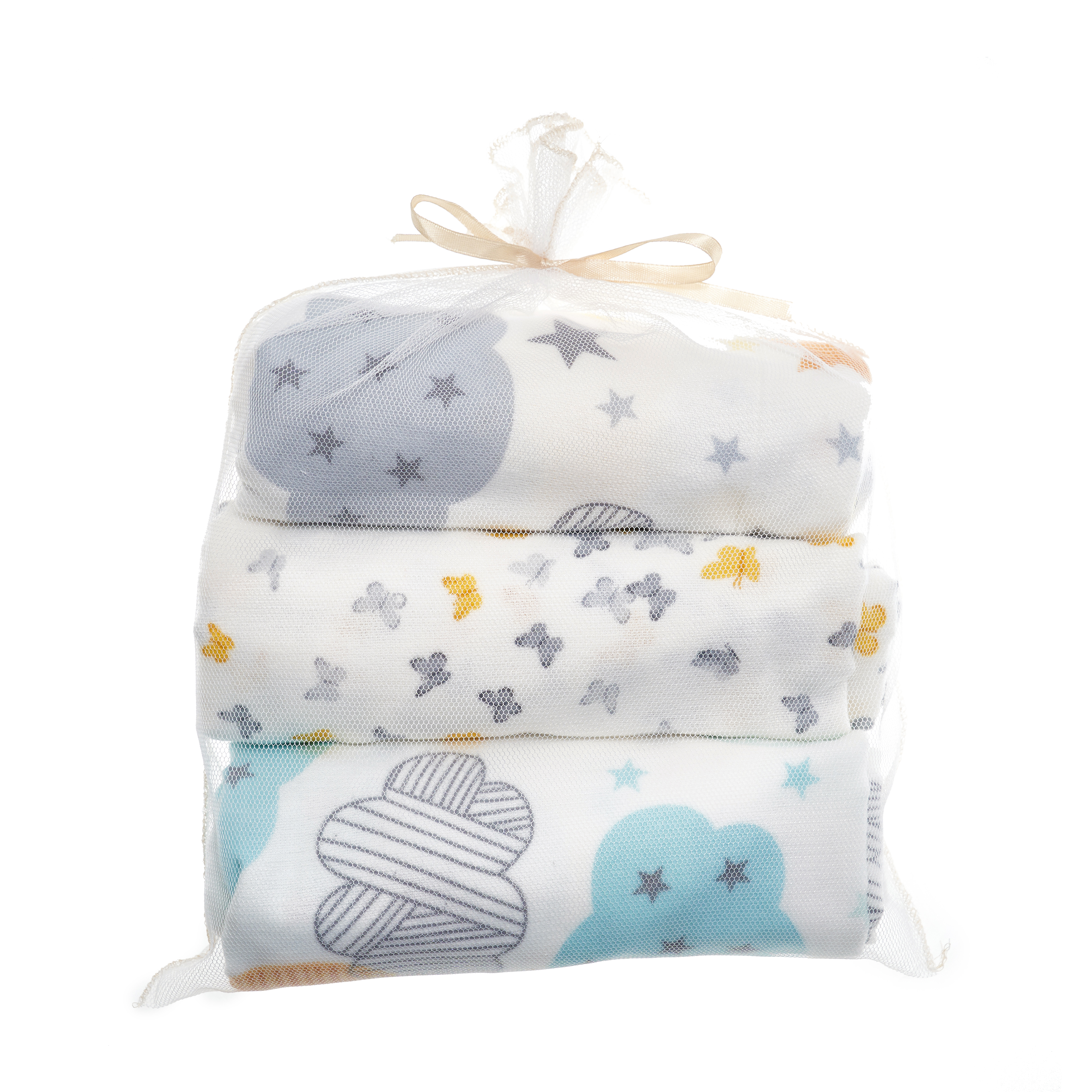 Комплект состоит из трех пеленок в разных цветах и принтах, которые можно подобрать под ваш вкус.