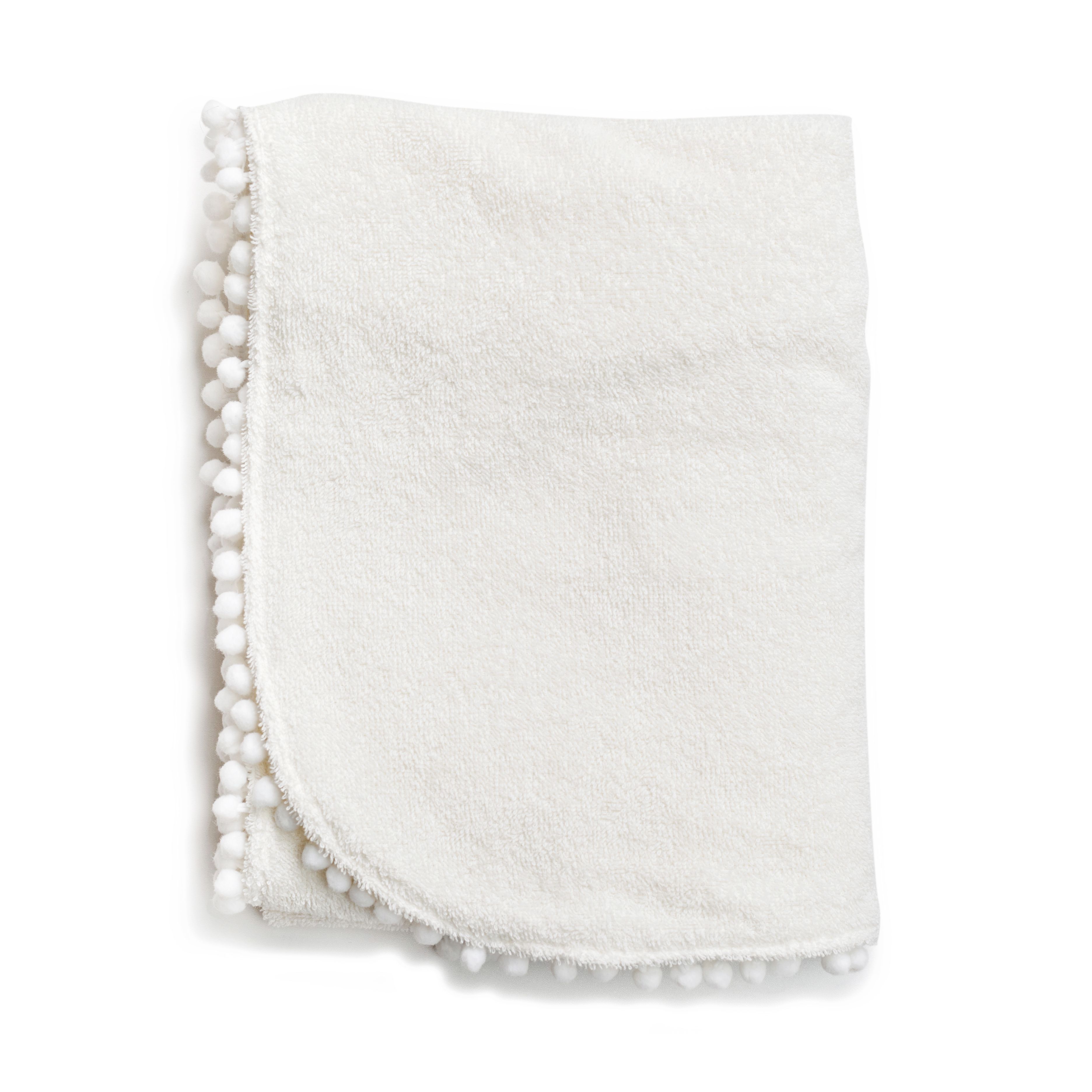 Стильный декор с помпонами придает пледу оригинальность и непременно понравится детям.