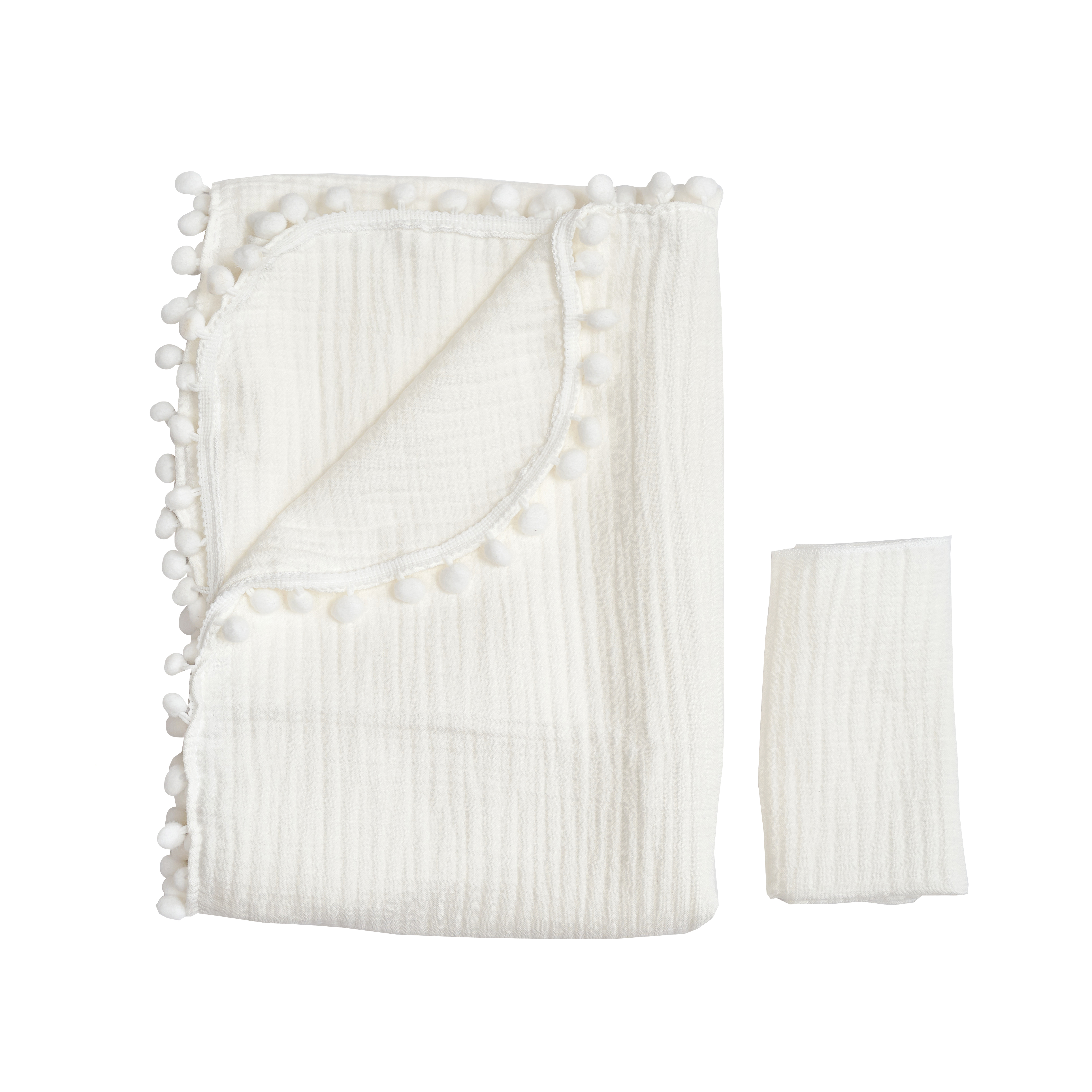 Плед Twins муслиновый 4-слойный 100х100 см с помпонами + салфетка – стильный и практичный аксессуар для вашего малыша.