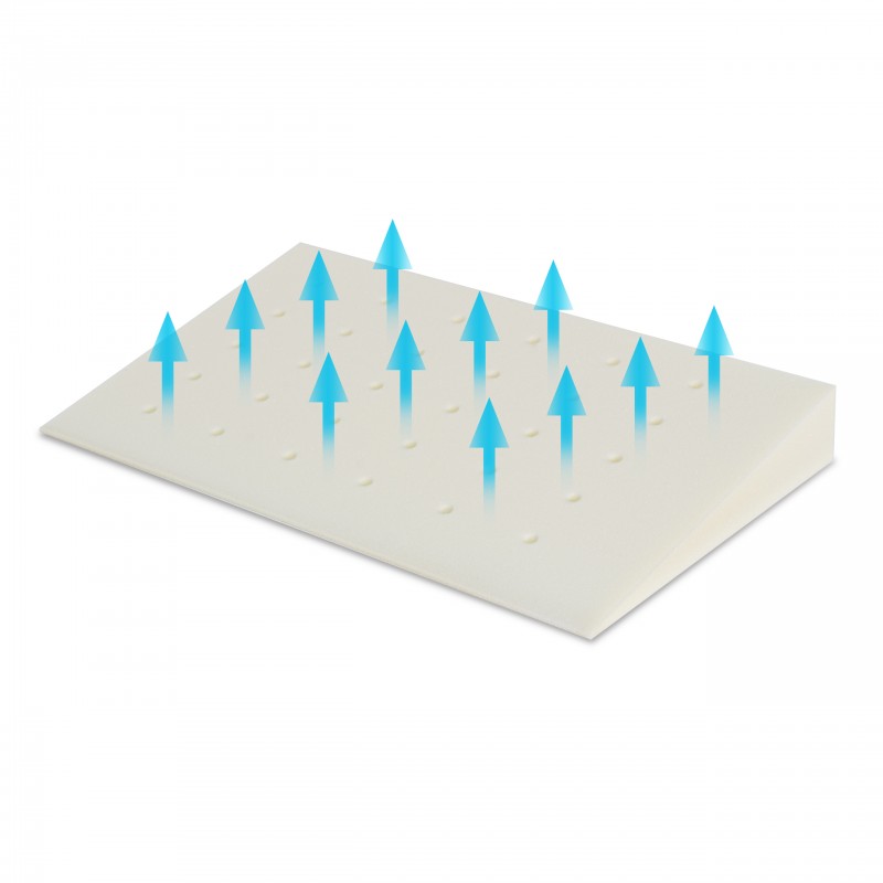 Подушка имеет вентиляционные отверстия и каналы, которые стабилизируют температуру и обеспечивают надлежащую циркуляцию воздуха, предотвращая перегрев и чрезмерное потоотделение.