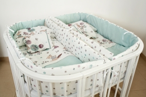 Постельный комплект состоит из 14 элементов, которые полностью укомплектуют кроватку для обоих малышей. Кроме привычных постельных принадлежностей в комплект входят два бамперы, которые дополнительно будут оберегать малышей во время сна.