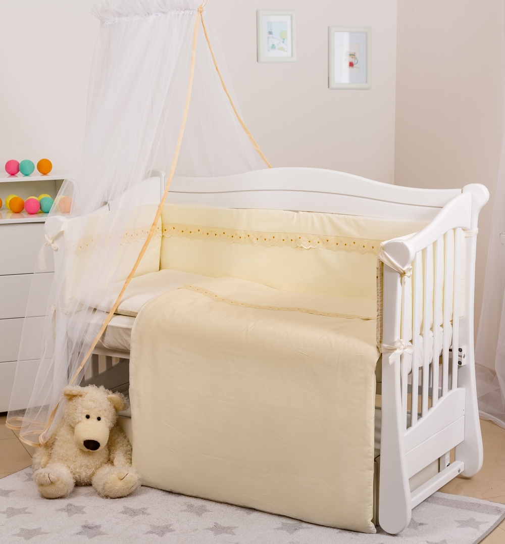 Комплект постельного белья Twins Magic sleep Classic М-008 состоит из 7-и предметов. Постель выполнена в лаконичном стиле и украшена нежным кружевом. Если Вы отдаете предпочтение спокойному дизайну детской кроватки, который впишется в любой интерьер детской комнаты или вашей спальни, то верный выбор - Magic sleep. Идеально подходит для кроватки новорожденного размером 120 × 60 см. Выполняет декоративную и защитную функцию. Постельные комплекты изготавливаются из высококачественного 100% хлопка плотностью -135 гр / м 2. Раздельный бампер состоит из 3-х частей и загораживает малыша от ударов, сквозняков. Им можно полностью заслонить малыша по периметру кроватки или только с одной или двух сторон, по желанию.