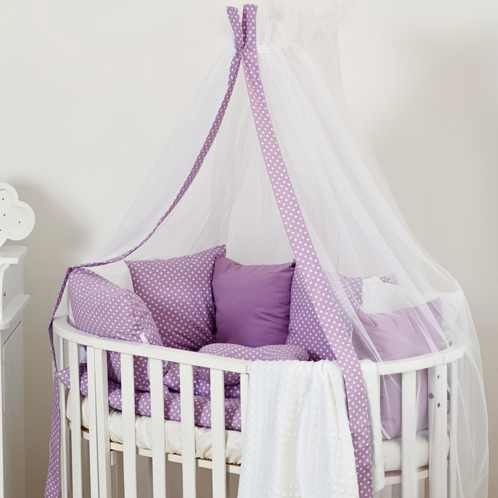 Материал основных элементов комплекта – миткаль; балдахин – миткаль и вуаль. Внимание! В комплект не входит держатель для балдахина. Комплект подходит для детской кроватки с размером спального места 120*60 см, а также детских кроваток круглой конструкции.